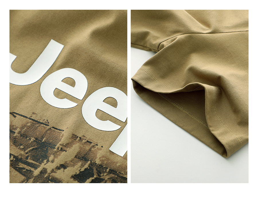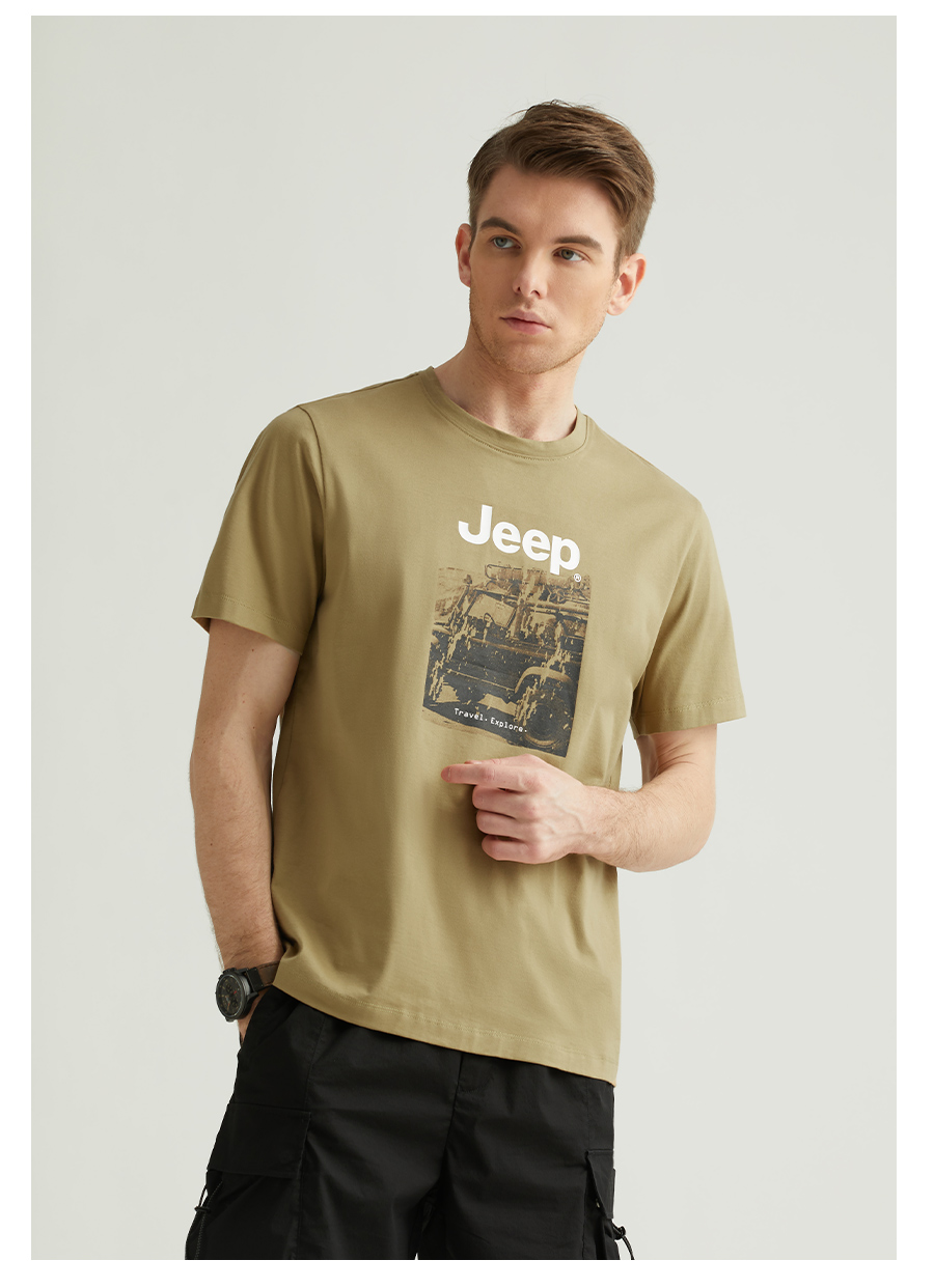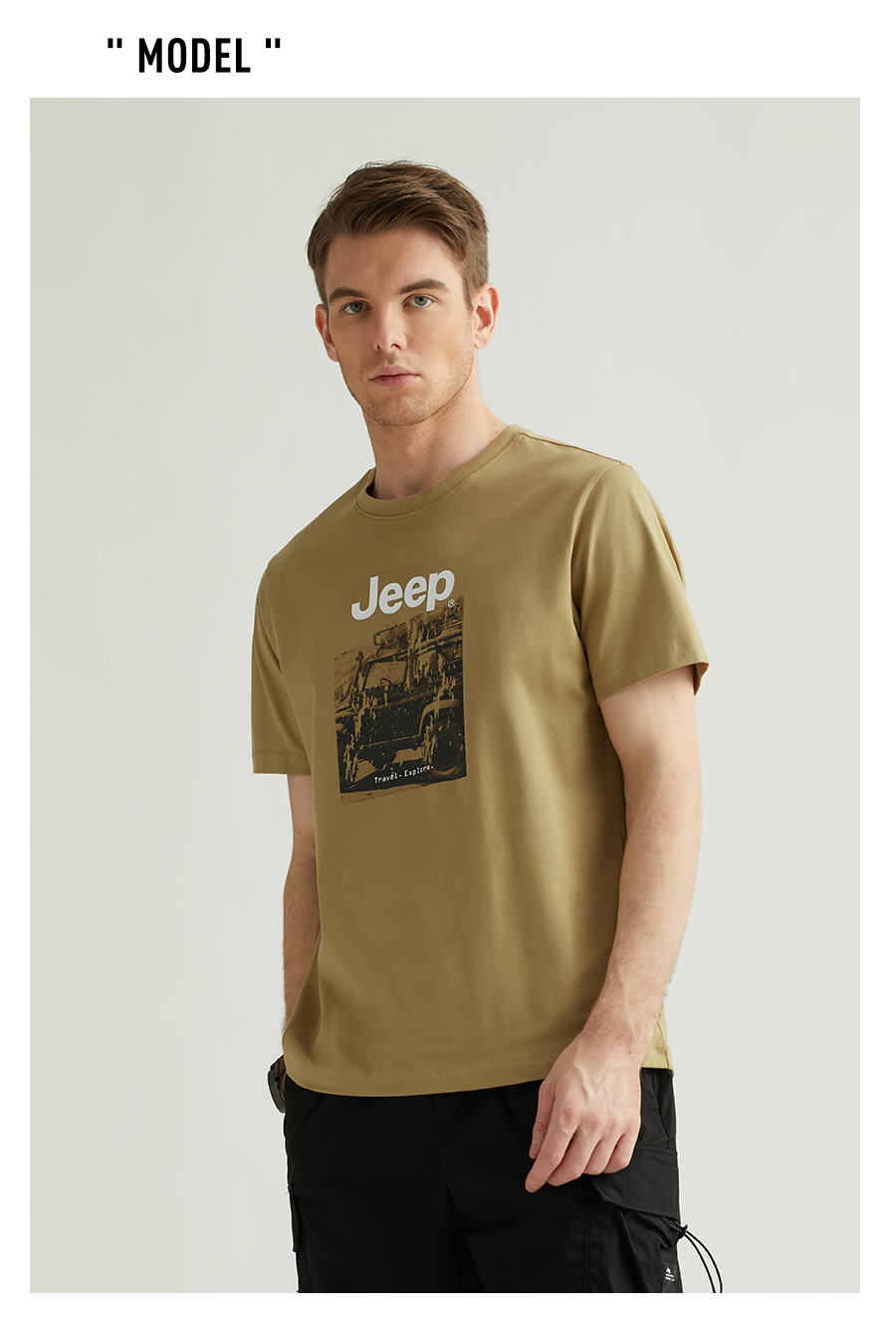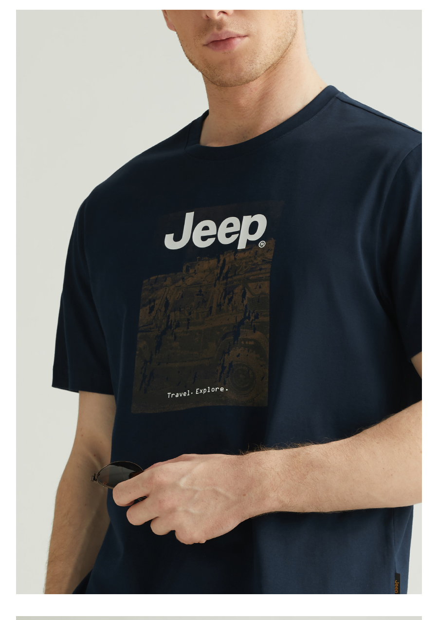 这款吉普Jeep男纯棉休闲印花T恤,是2022年夏季新款,使用100%纯棉面料,柔软亲肤,吸湿吸汗,厚度上也偏薄,夏季穿更透气,同时还带弹性,上身更舒服。