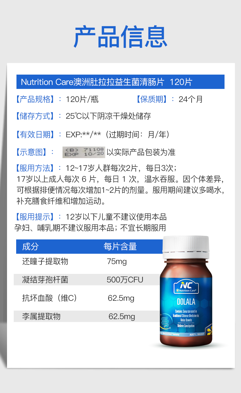 这款是NutritionCare 肚拉拉益生菌清肠片,能助力肠道触动快速通便,同时平衡肠道微生态,搭配的西草精华,安全起效快,不含番泻叶成分。