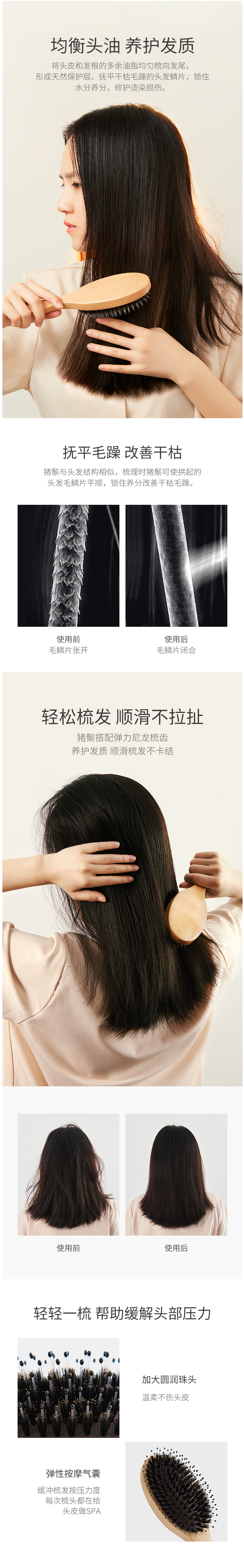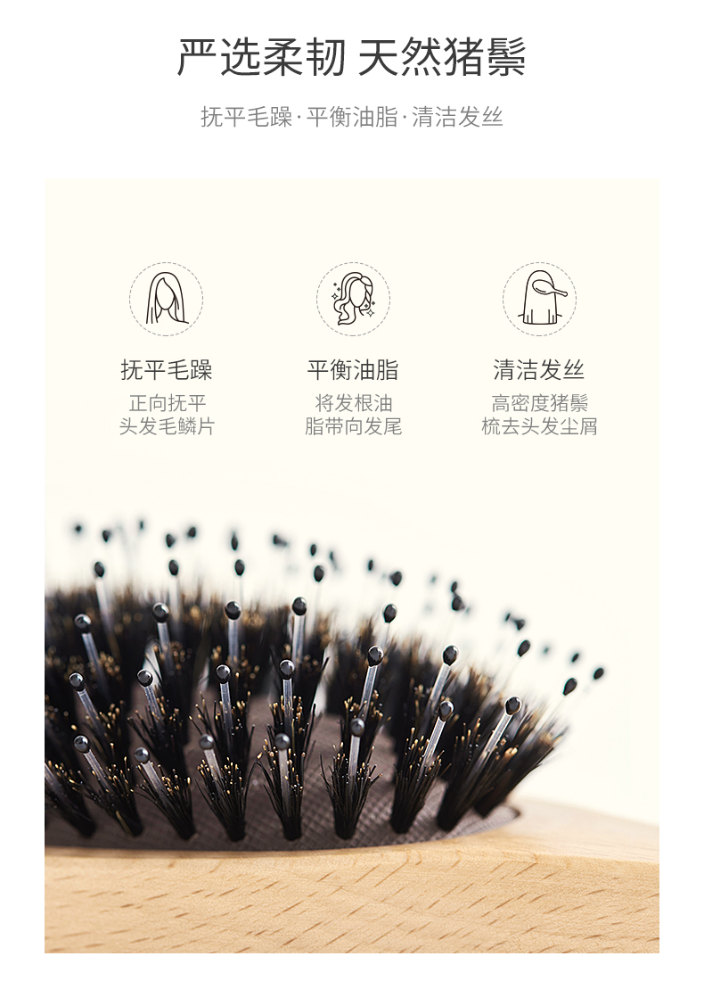 天然猪鬃能抚平头发毛躁,平衡油脂,高度清洁发丝,使用过程中顺滑不拉扯。