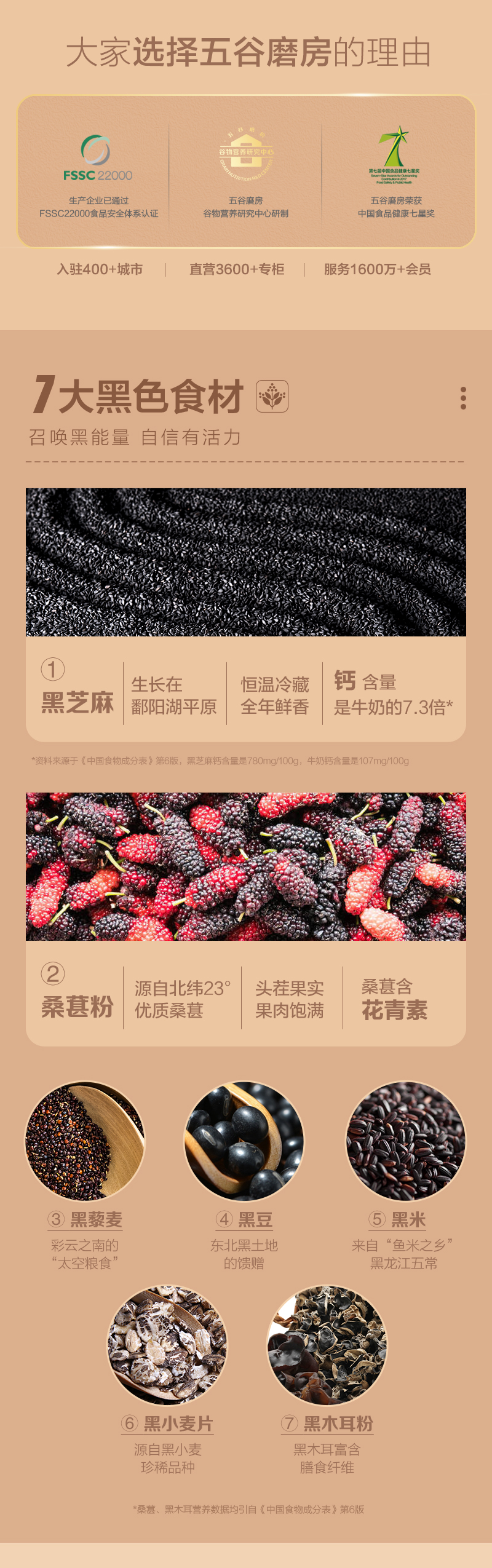 这款五谷磨房 核桃芝麻桑葚代餐粥,规格:600g,甄选鄱阳湖平原的黑芝麻,钙含量是牛奶的7.3倍;北纬23°的优质桑葚,富含花青素;彩云之南的“太空粮食”黑藜麦、东北黑土地的黑豆、“鱼米之乡”黑龙江五常的黑米、珍稀黑小麦片、富含膳食纤维的黑木耳粉,7大黑色食材,科学配比,黑芝麻含量>7.5%,核桃仁>0.4%,桑葚粉>1.2%,高纤高钙,补充多种营养。每罐600g,一次40g (约2-3勺),可以吃15餐左右。
