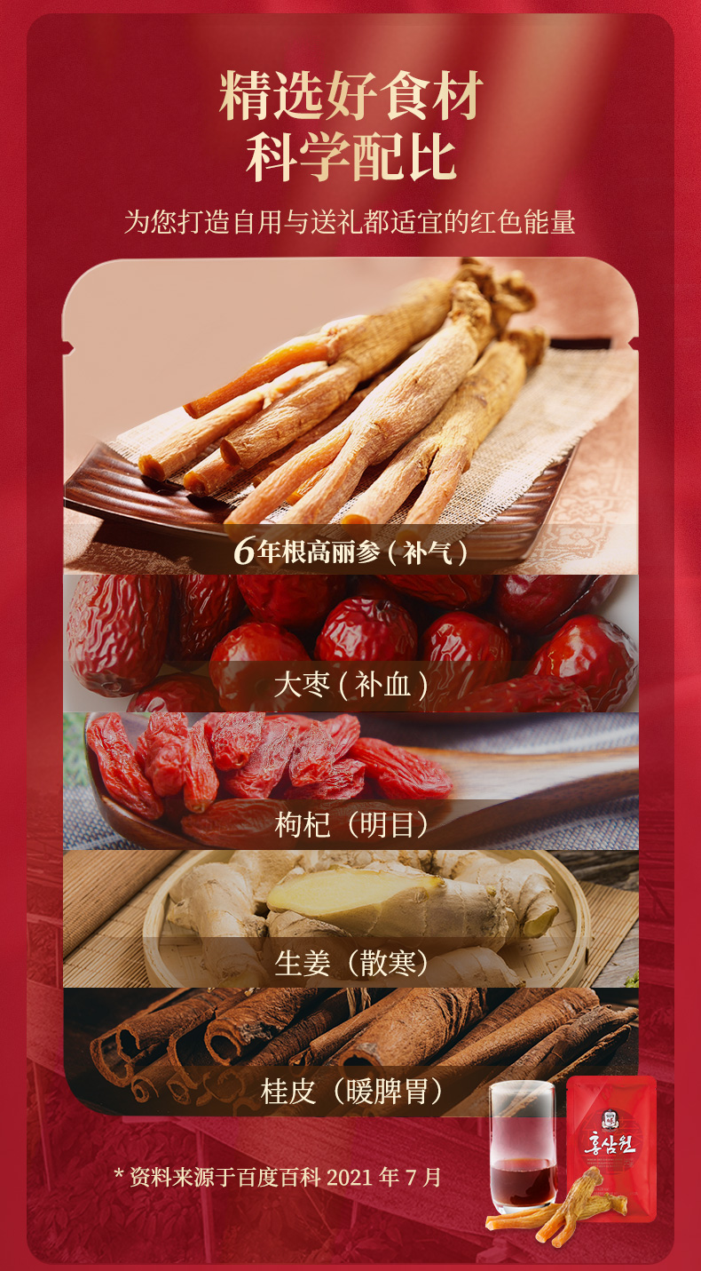 这款正官庄6年根高丽参元液,以6年根高丽参为原材料(高丽参富含32种人参皂甙),再以大枣(补血)、枸杞(明目)、生姜(散寒)、桂皮(暖脾胃)浓缩液为辅料。特点是易吸收,每支人参皂甙含量达10-20mg。服用方法:1日1次。能够大补元气,提高记忆力,小瓶包装,携带十分方便,可以随时随地饮用来增强活力。