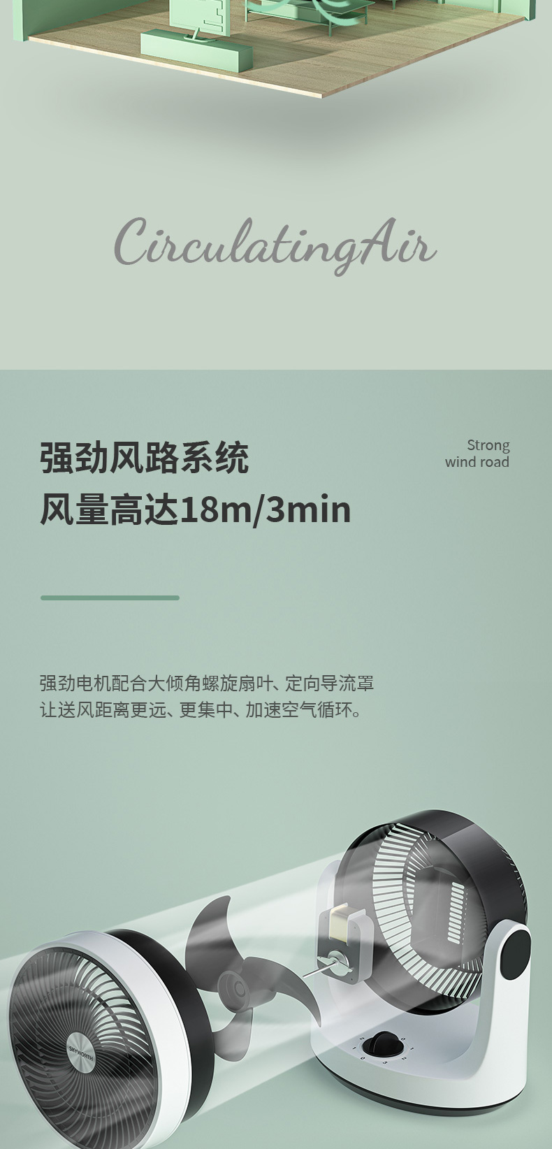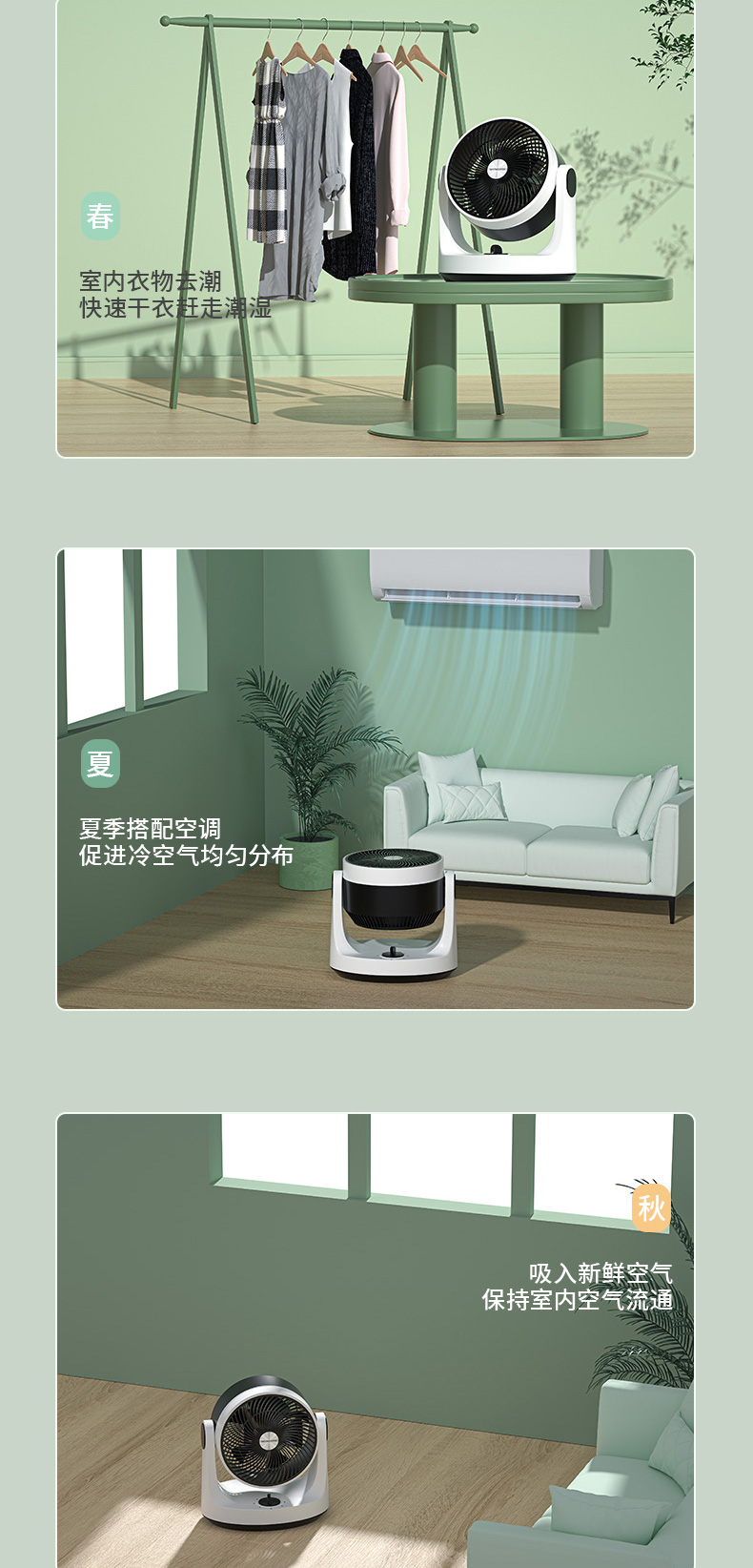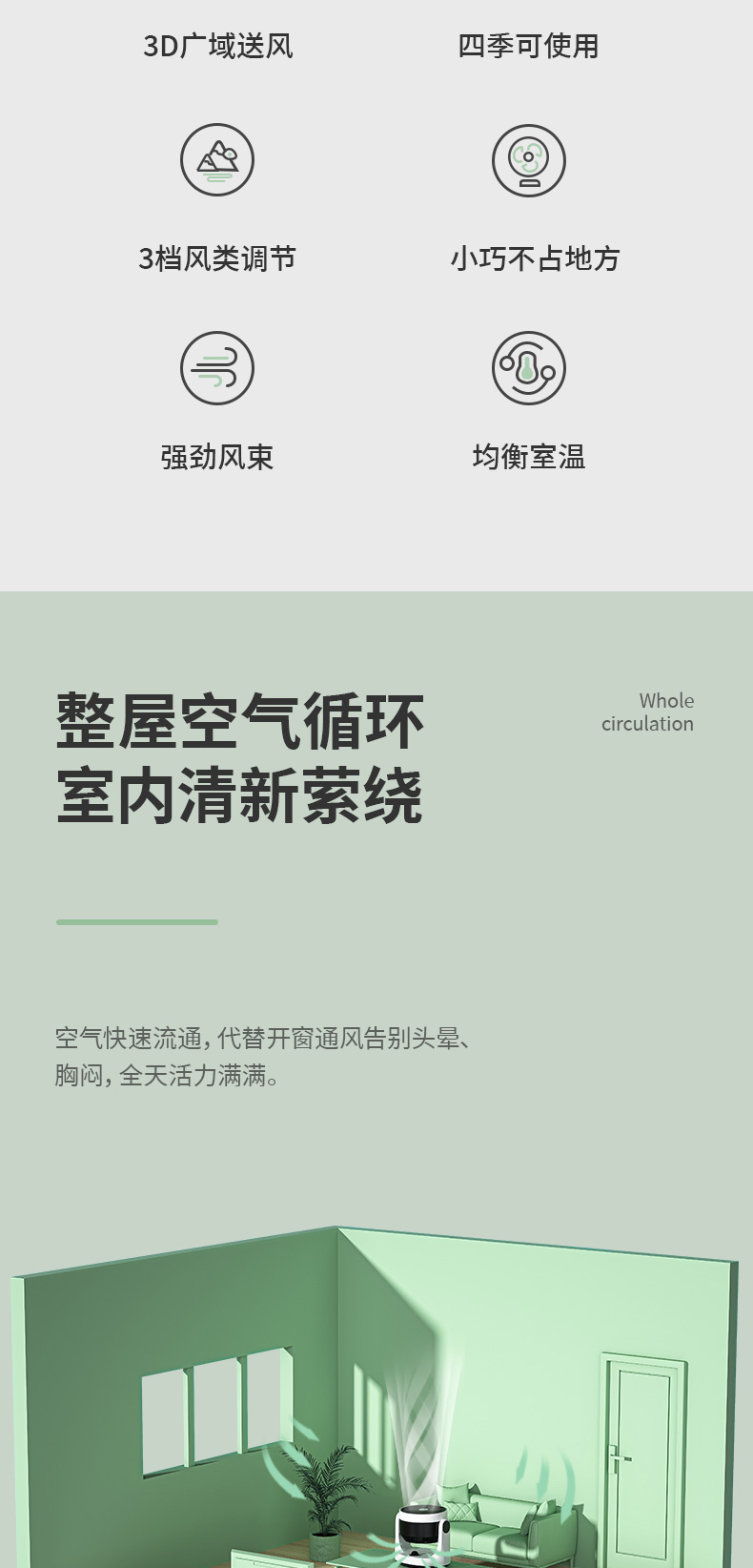 空气循环扇能够迅速地聚集气流,将聚集的气流喷射出去,遇到障碍物后气流扩散,从而产生了空气循环气流。也就是说对着人吹是没有传统风扇的伤害的,特别适合宝宝、老人使用。家里装修之后,用空气循环扇来加速室内空气的流通,可达到加速散味的效果。