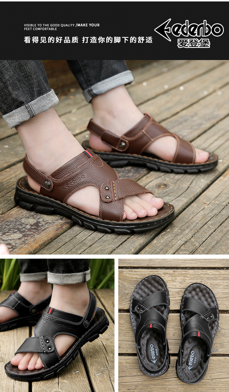 爱登堡 男式真皮凉鞋两用沙滩鞋 ,精选头层牛皮鞋面,柔软细腻,柔软透气,且有光泽;乳胶夹层鞋床,贴合省力,拒水打滑,行走省力不打滑;手工缝制,加厚按摩底,省心两穿设计,凉拖随心切换;弹力气垫鞋底,柔软舒适软弹。