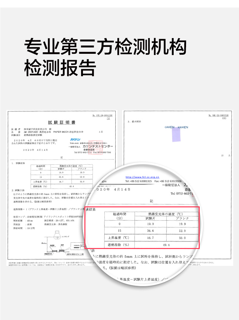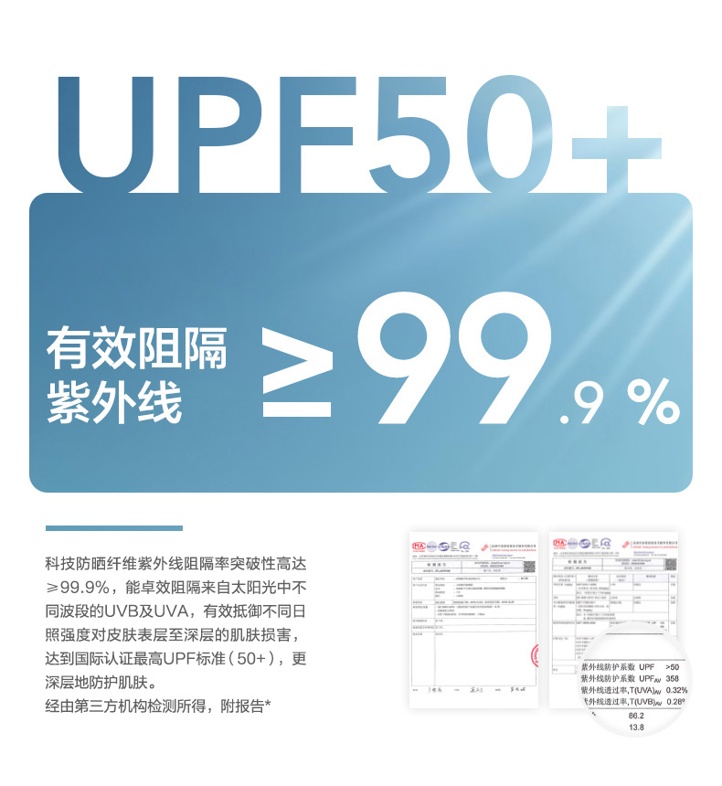 经必维国际检验集团BureauVeritas、瑞士纺织检定机构TESTEX、日本检测机构KAKEN等多家世界知名检测机构共同检测、认证,符合国际抗紫外线测试协会发布标准UV Standard 801及 欧盟、新西兰等地标准规范,能实现紫外线阻隔率99%、UPF 50+。