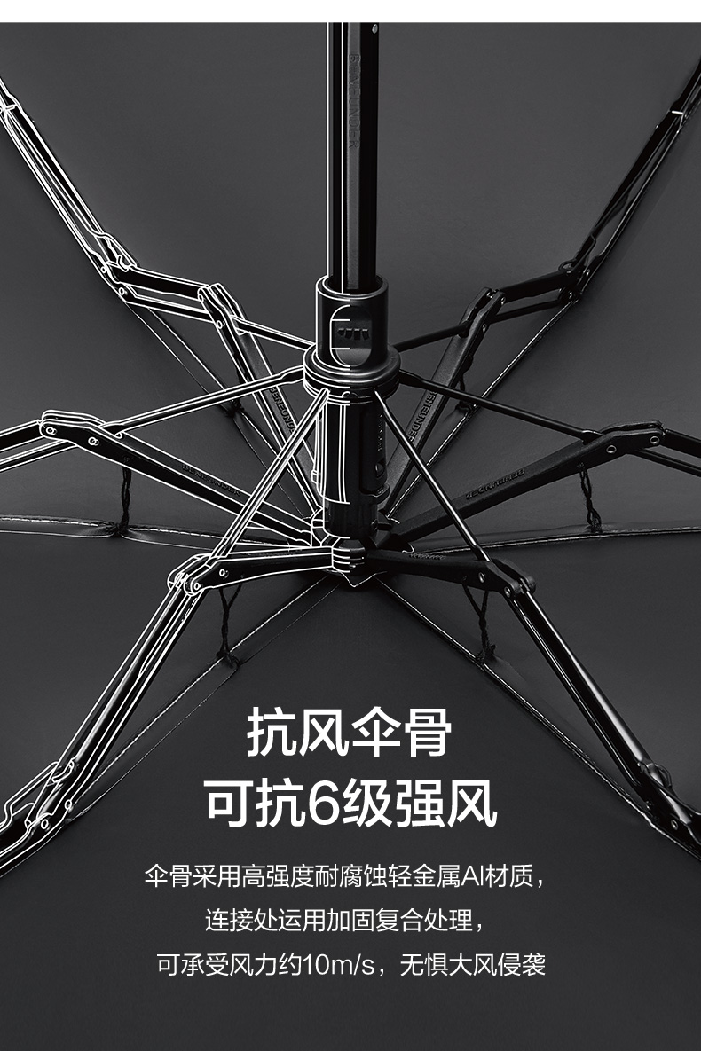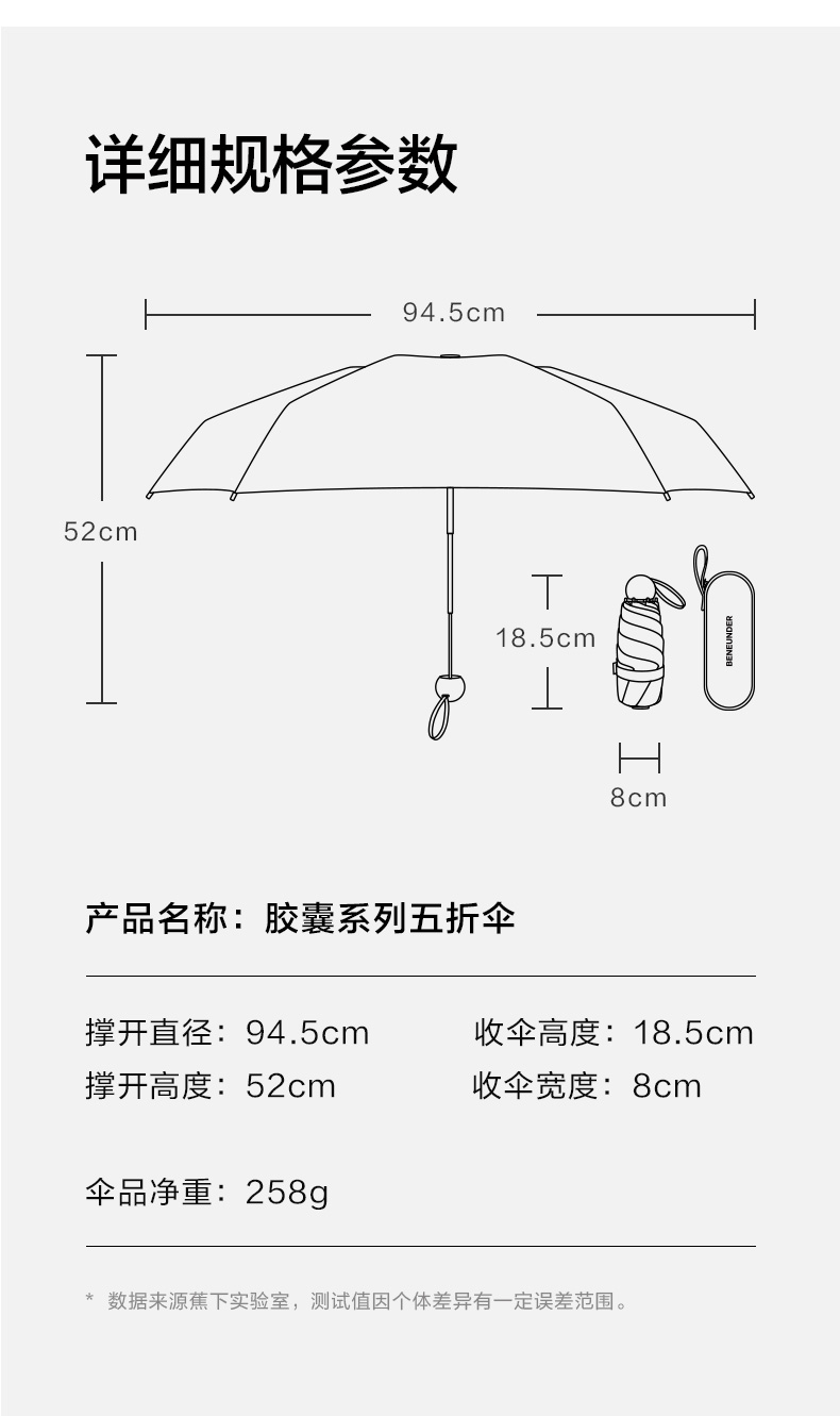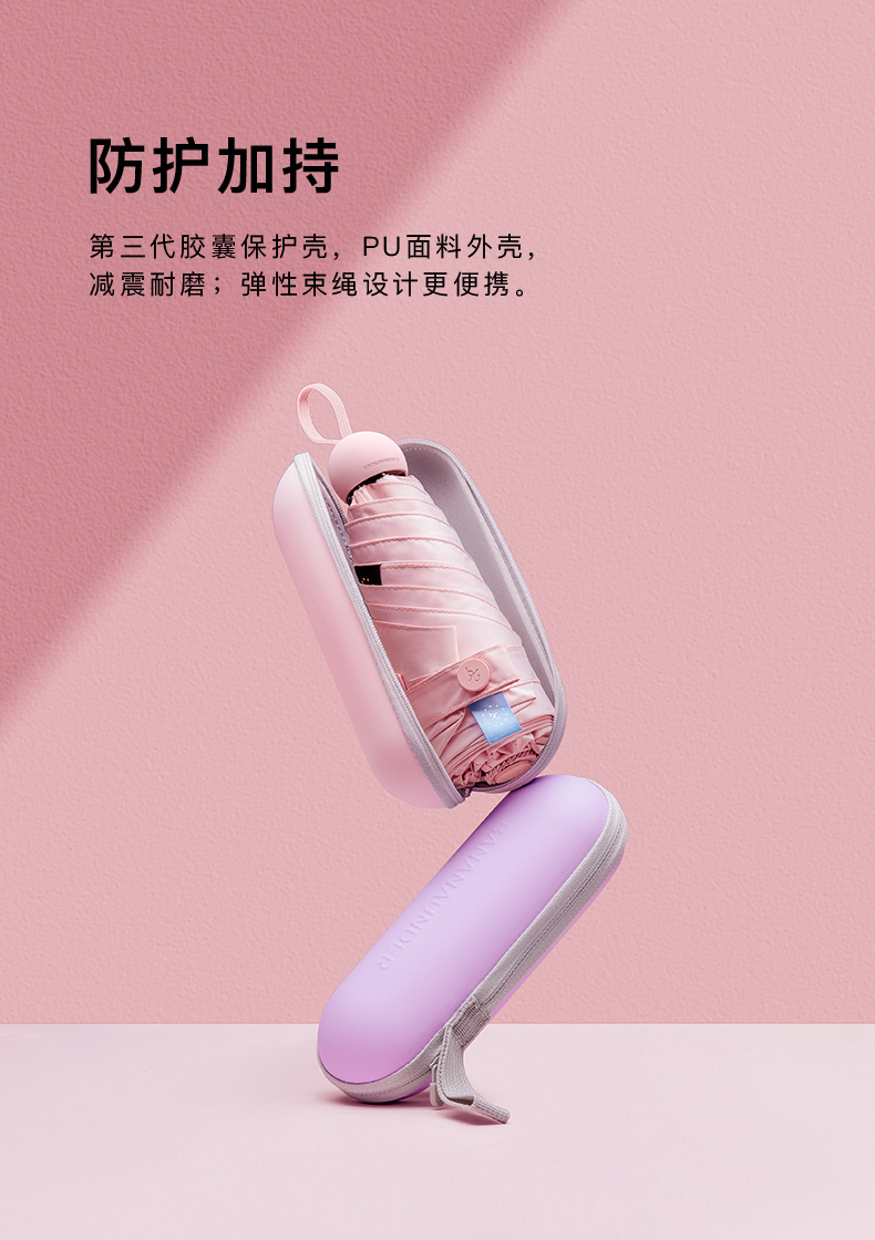 这款是经典胶囊伞系列,专为日常出行打造的五折伞。外层伞布附以L.R.C防晒涂层,隔热遮阳,紫外线阻隔率高达99%,upf50+。伞骨采用高强度耐腐蚀轻金属Al材质,连接处运用加固复合处理,可承受风力约10m/s,无惧大风侵袭。