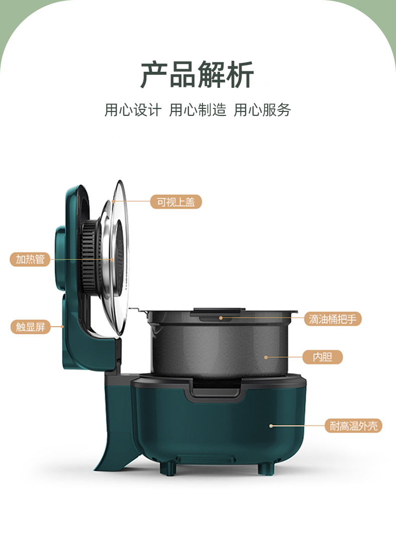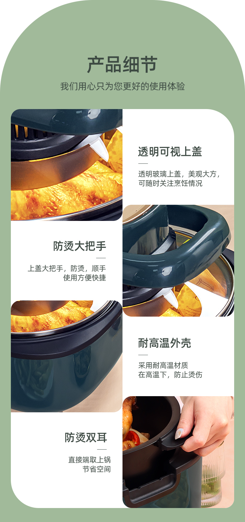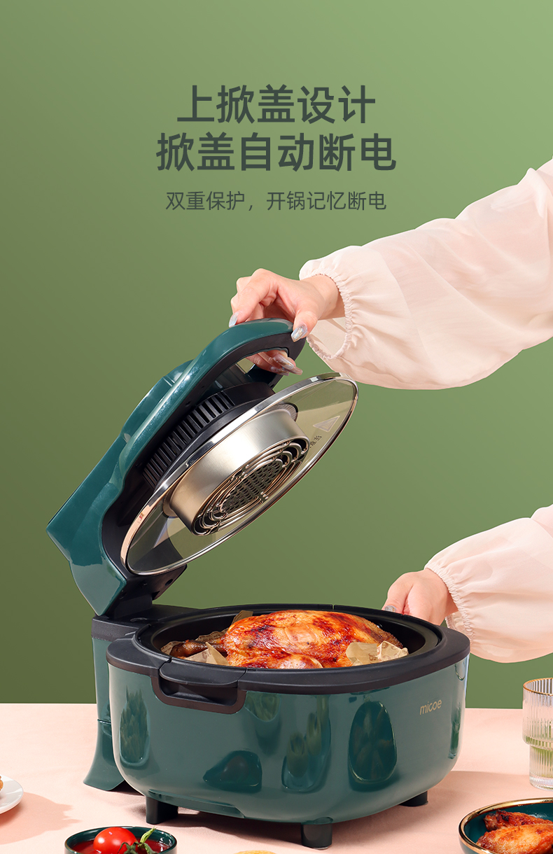 细节上:上揭盖设计,开盖自动断电,带有记忆断电功能,大把手设计,开盖方便,有效防止烫伤,内胆防烫双耳,端取方便节省空间,内胆不沾涂层,一冲一抹即净,餐后清洁非常方便。