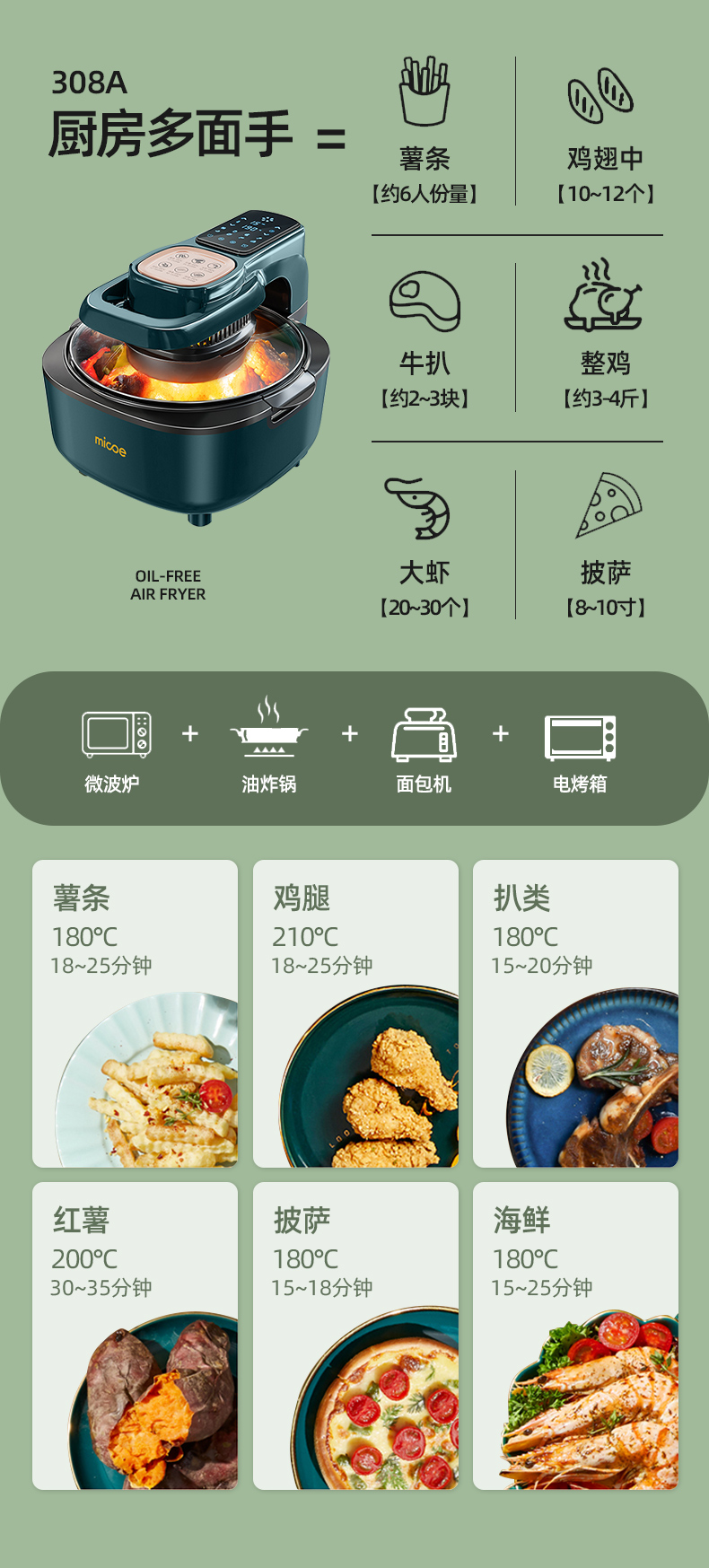 空气炸锅适合烹饪各种肉类、薯条、蛋挞(某宝上可直接买坯子 蛋液)。也可加热买来的外卖熟食,如 披萨、香肠、猪蹄、面包片类之类的,还是很方便的,也是厨房中实用比较高的厨具。