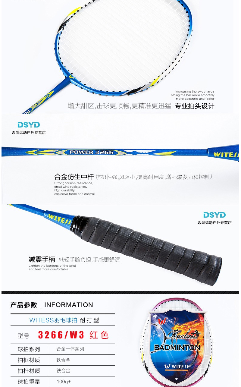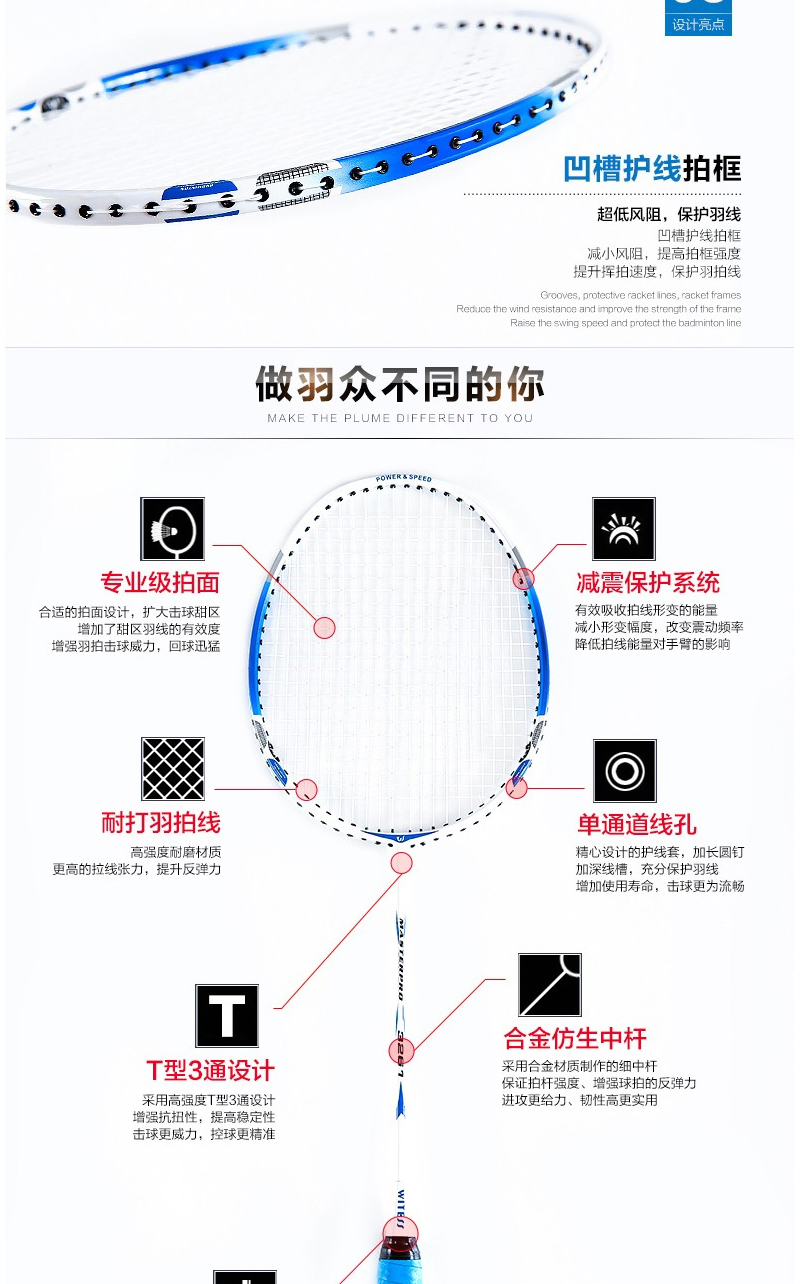 专业级拍面:合理的拍面,扩大了击球甜区,增加了甜区羽线的有效度,增强羽拍击球威力;