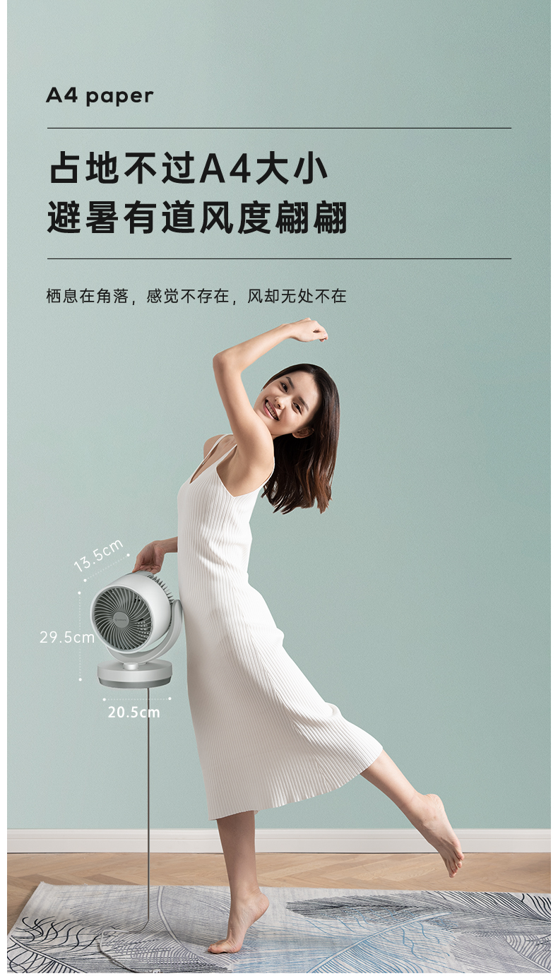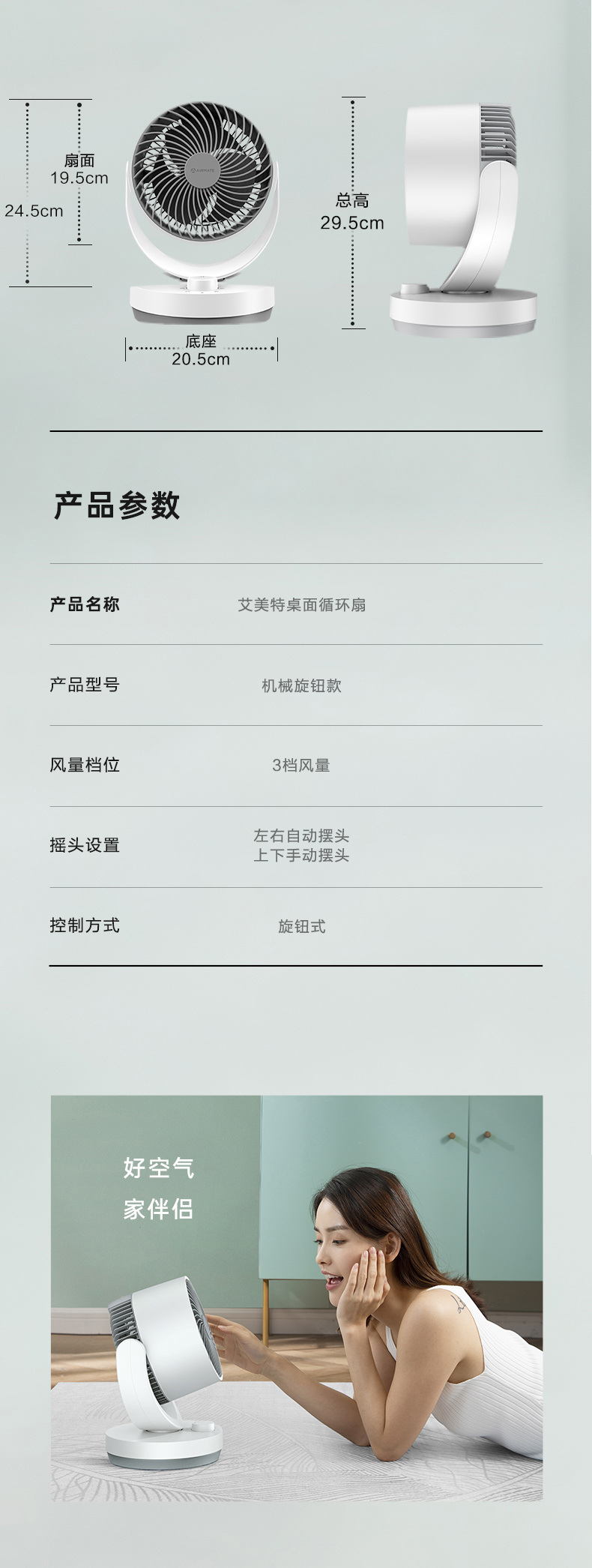 这款艾美特空气循环扇,能上下左右广角送风,可以使得室内空气,循环流动起来,把底部的冷气,往上吹;旋涡气流,出风量大,风感细密绵柔,不吹人;可配合空调、取暖器和空气净化器使用,在大部分家庭的客厅和卧室完全没问题。