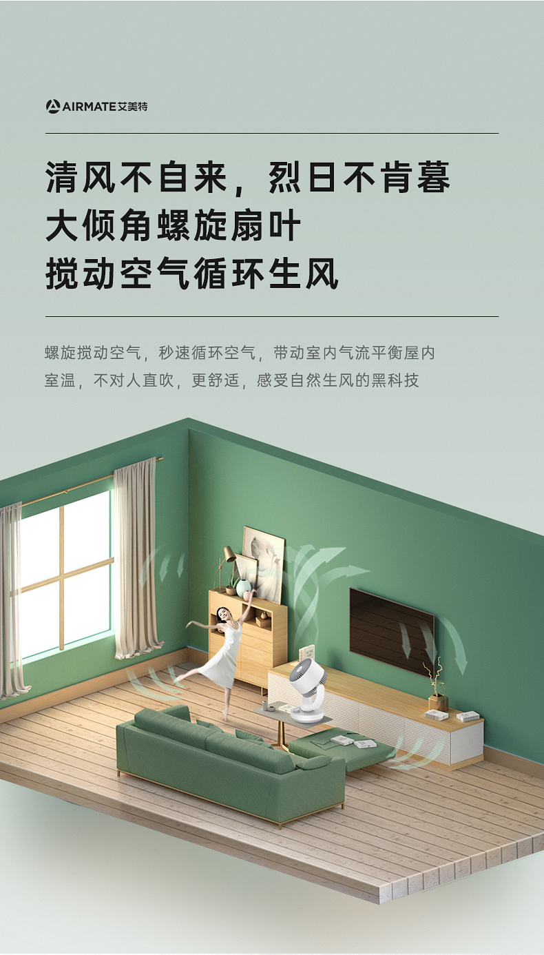 大倾角螺旋扇叶,风力强劲,气流集中,送风距离远,再通过空气动力学的技术,创新的立体交互系统,让室内与室外空气形成立体交换,房间内无死角送风。