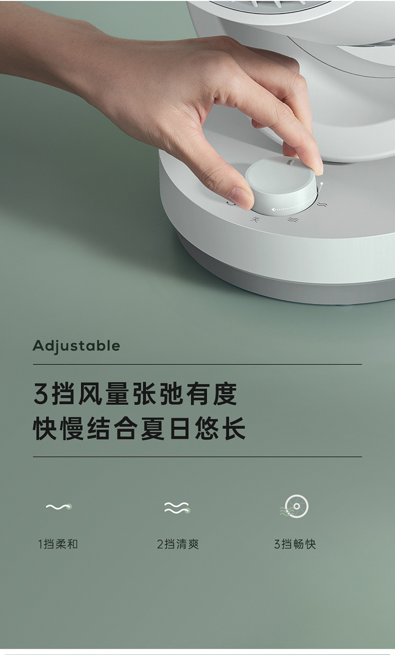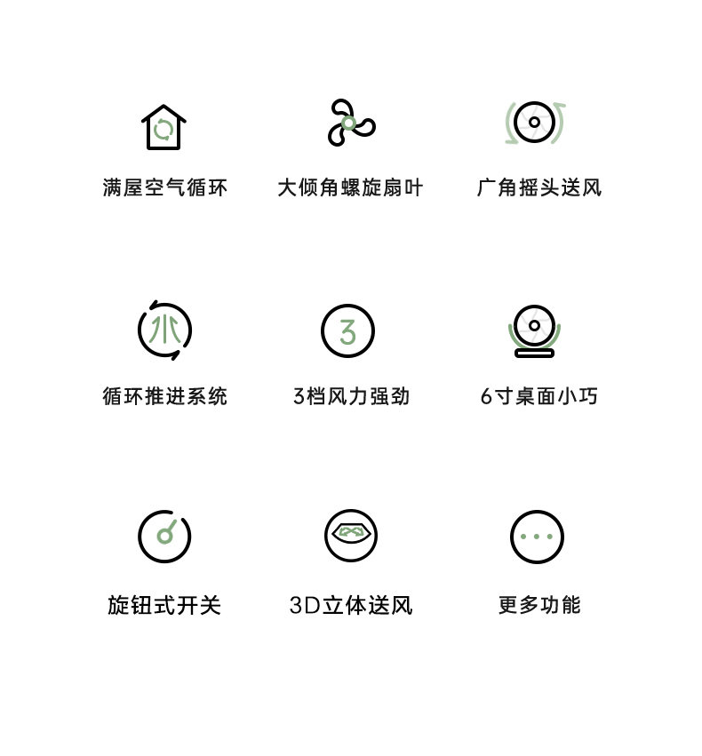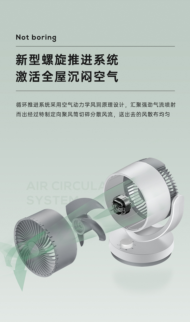 使用新型螺旋推进系统,运用空气动力学风洞原理设计,汇聚强劲气流喷射而出,经过特制定向聚风筒切碎分散风流,送出去的风散布均匀。