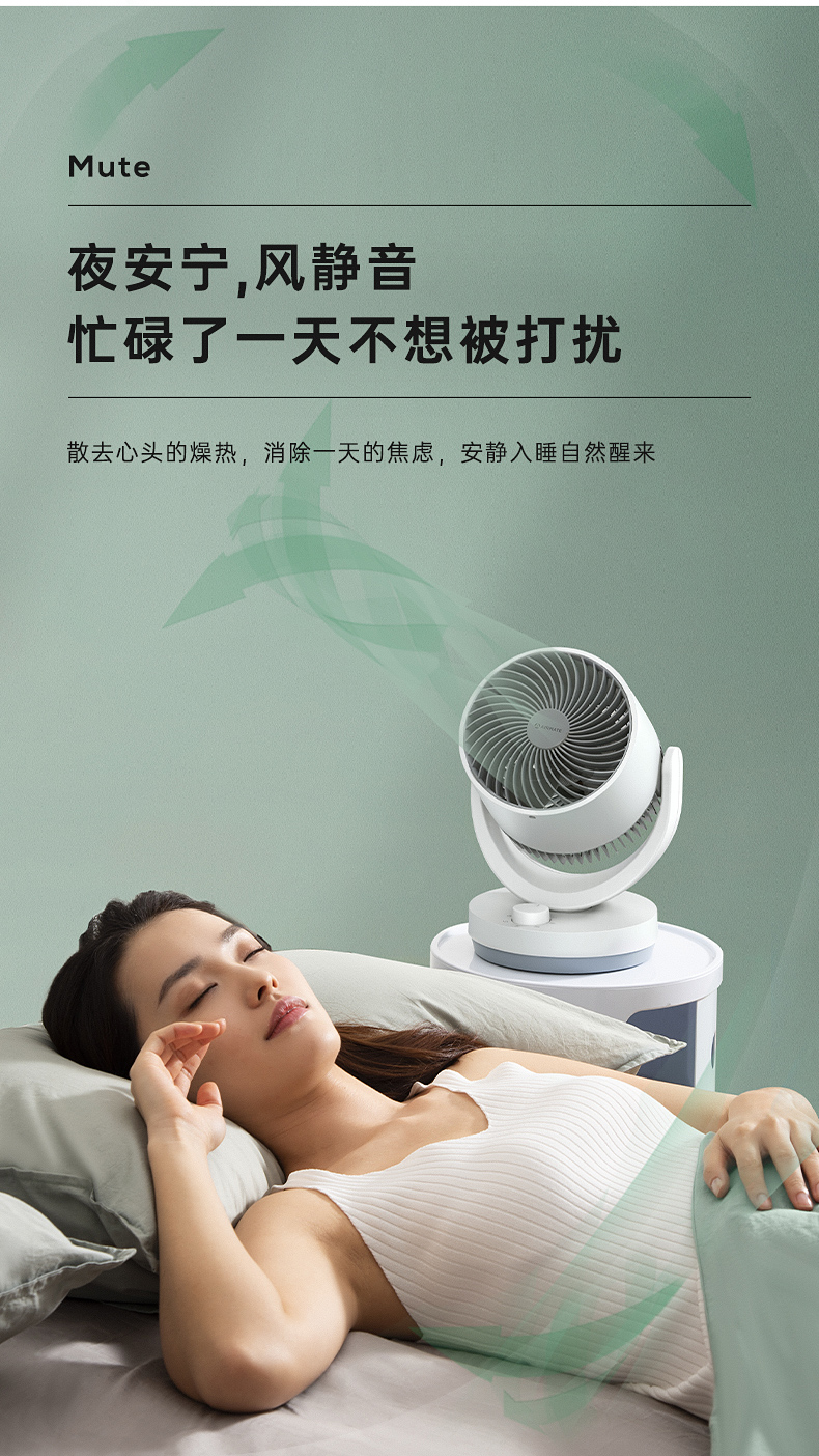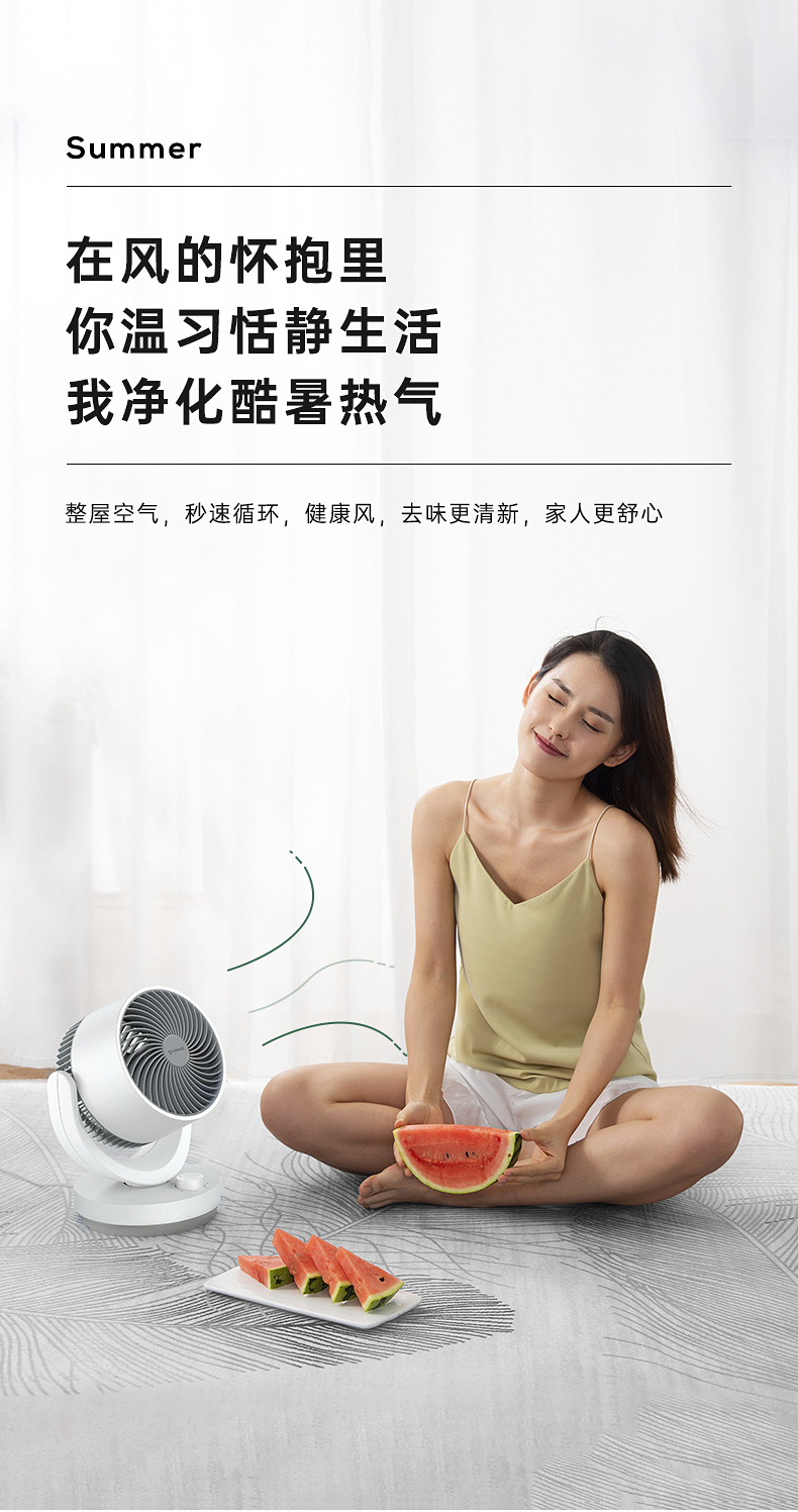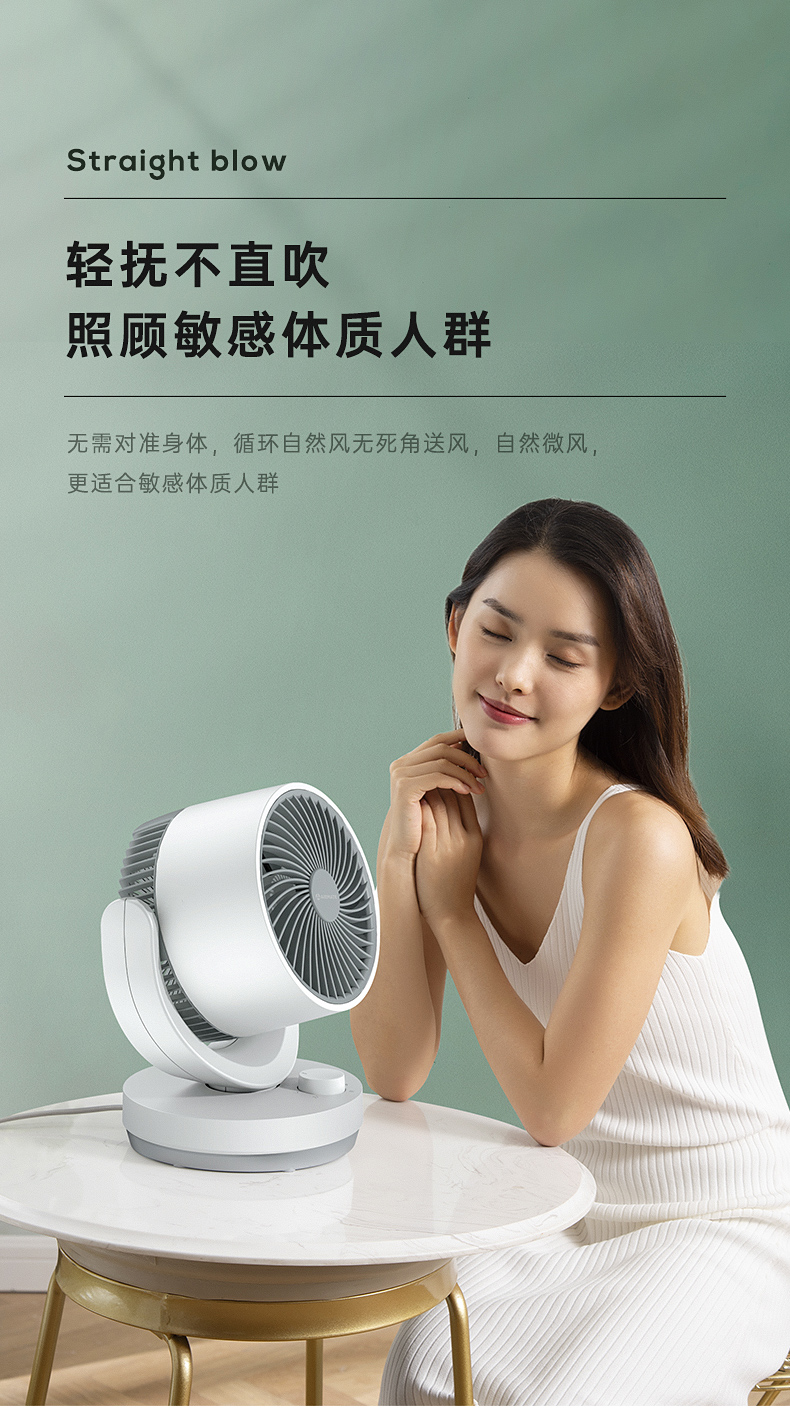 空气循环扇能够迅速地聚集气流,将聚集的气流喷射出去,遇到障碍物后气流扩散,从而产生了空气循环气流。也就是说对着人吹是没有传统风扇的伤害的,特别适合宝宝、老人使用,与空调搭配使用,最赞了。