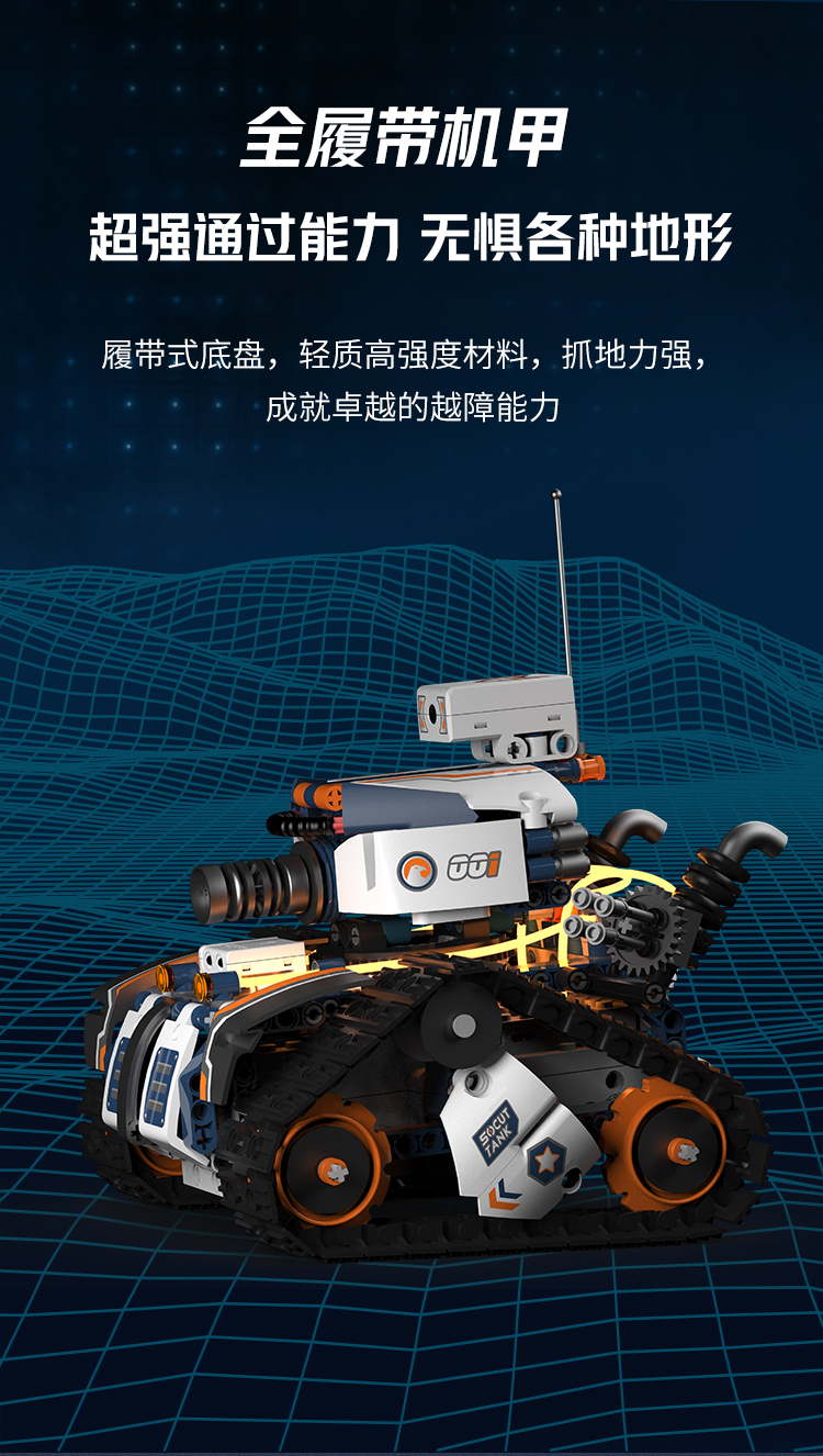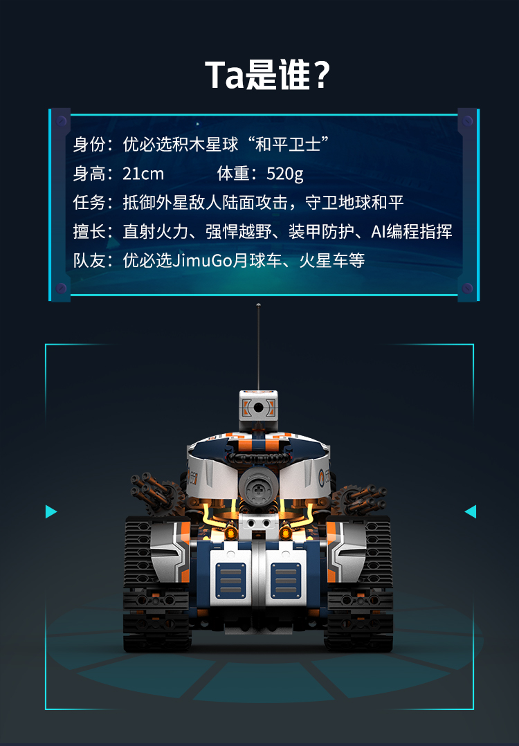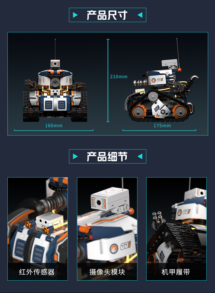 这款UBTECH 优必选 侦察坦克,由440多个零部件(包含装饰件及连接件等)自由创意拼搭而成,使用UBTECH的Jimu Robot App,即可根据步骤说明,为可视化的模块编程让孩子循序渐进的学习逻辑程序,拼装完成后的坦克尺寸约为21×16×17.5cm,全履带机甲,超强通过能力,无惧各种地形,通过摄像头可进行第一人称视角(FPV)操控,带来身临其境的驾驶感,红外传感模块加持,智能感知障碍物,保护机身。Scratch & Python编程控制为坦克编写各项指令,体验编程乐趣,模拟发射音效,多色信号灯,可转动炮台,360°调整机枪角度,可调节排气管。让孩子在学习过程中掌握机器人组装知识,开启孩子们对电脑程序设计的兴趣。