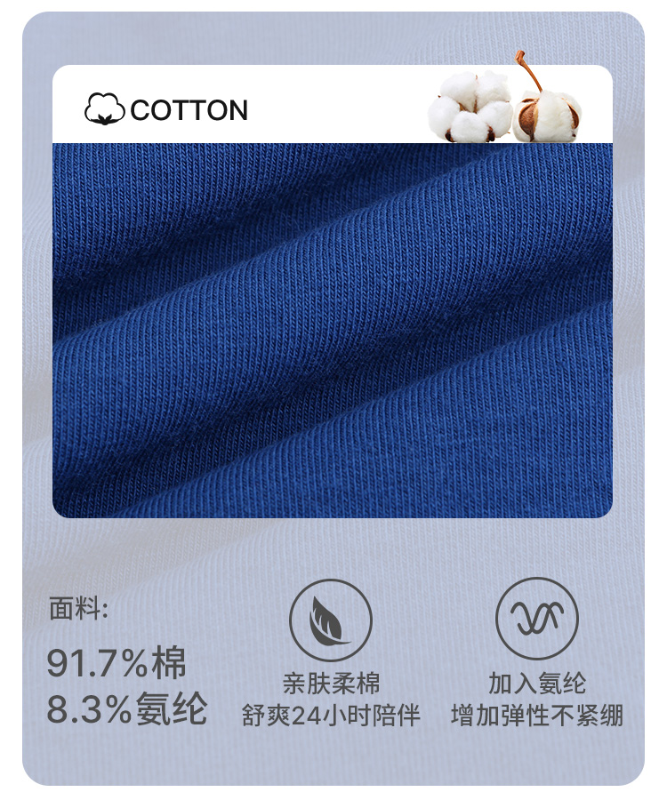 纯棉面料,主要成分91.7%棉+8.3%氨纶混纺,兼具透气性和舒适性,告别闷热,面料高弹穿着舒适不紧绷,双层前浪立体包裹,一片式无侧缝,更少缝合线,加宽橡筋腰头、无感标签,穿着体感更舒适。