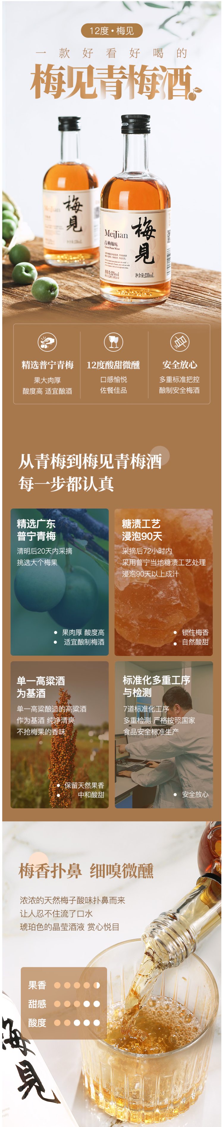 酿制方面:采用国家地理标志认证的普宁青梅,精选过大肉厚青梅,遵循传统工艺,采摘后72小时内糖渍工艺处理,历经90天缓慢出汁,保留纯粹青梅滋味。选用单一高粱酿造的高粱酒作为基酒跟其他白酒比起来口感更纯净,杂味更少,能更好的跟青梅融合,达到酸甜平衡没有杂味。