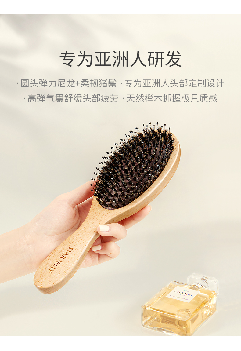 这款Star Jelly防静电气垫按摩梳,干湿两用。专为亚洲人头部研发,刷面是圆头弹力尼龙+柔韧猪鬃在组合,高弹气囊舒缓头部疲劳,天然榉木手柄抓握极具质感。