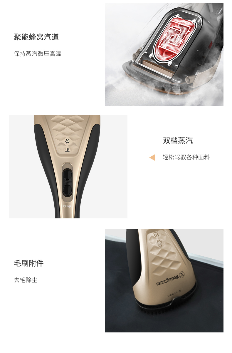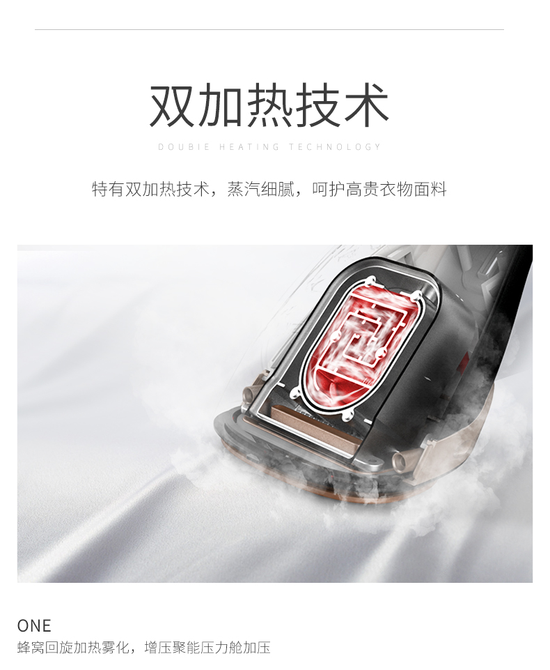 细节上:特有的双加热技术,蜂窝回旋加热雾化,增压聚能压力仓加压,蒸汽输出可达1米,智能精细控温,温度适宜,蒸汽细腻,呵护高贵面料。高颜值外观设计,流线型形机身,握感舒适,蜗牛式壁挂装饰,小巧不占地方,让生活更加充满艺术感。
