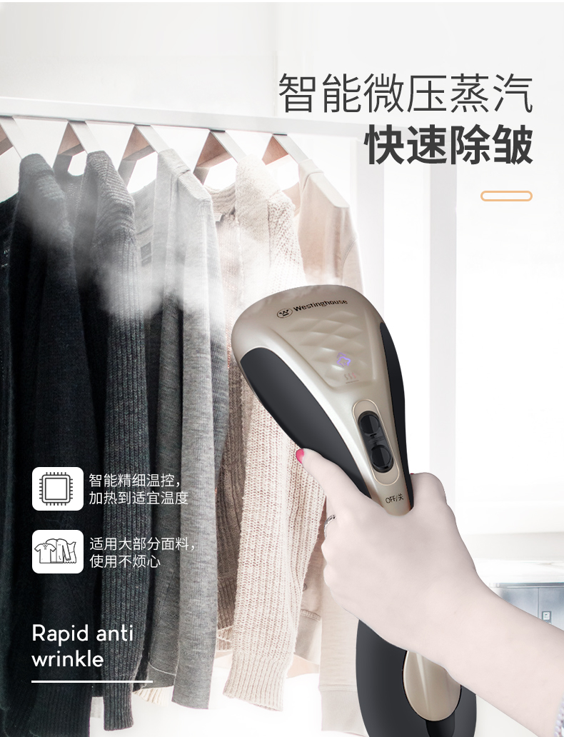 美国西屋 迷你手持挂烫机,1200w大功率智能微压,蒸汽细腻输出强劲,可干湿双烫,不仅可以除皱,还可以给衣服定型,150ml可透视水箱,可连续熨烫长达7分钟,轻松熨平3件衣服。商旅家用都适合。