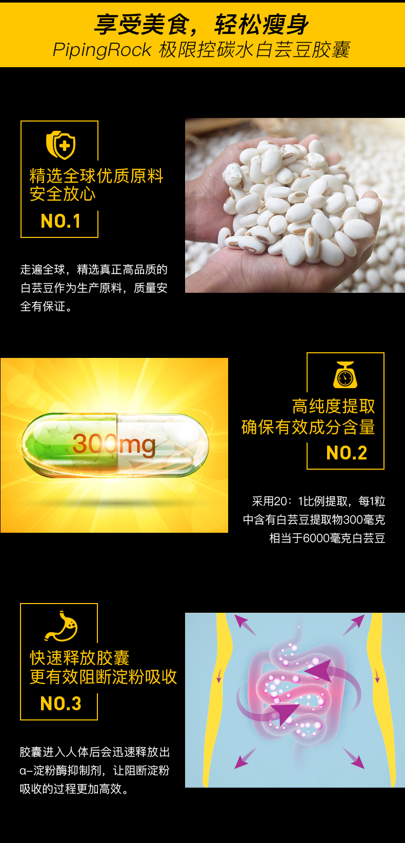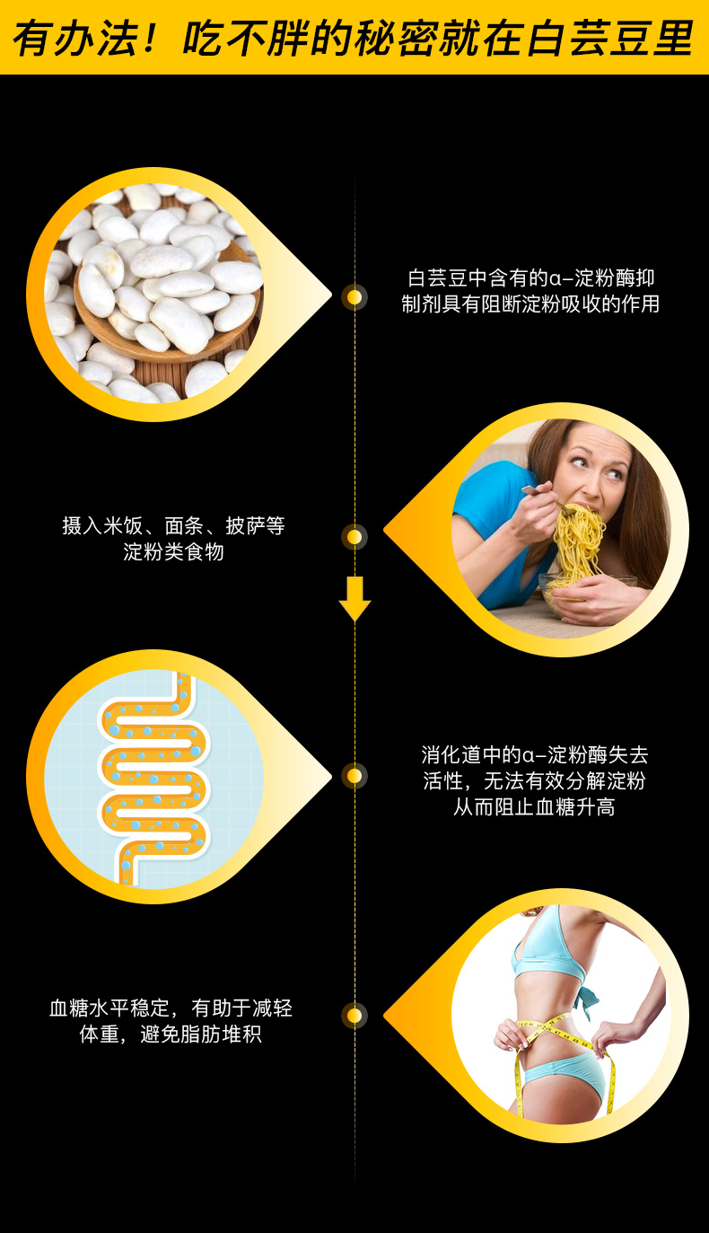 白芸豆中含有的a-淀粉酶抑制剂,具有阻断淀粉吸收的作用。,阻断淀粉分解,减少葡萄糖吸收,降低脂肪合成,吃货减肥不挨饿,采用20: 1比例提取,每1粒中含有白芸豆提取物300毫克相当于6000毫克白芸豆,阻断淀粉吸收更高效,适用减脂塑形人群、肥胖人群、缺乏运动者、对美食毫无抵抗人群。