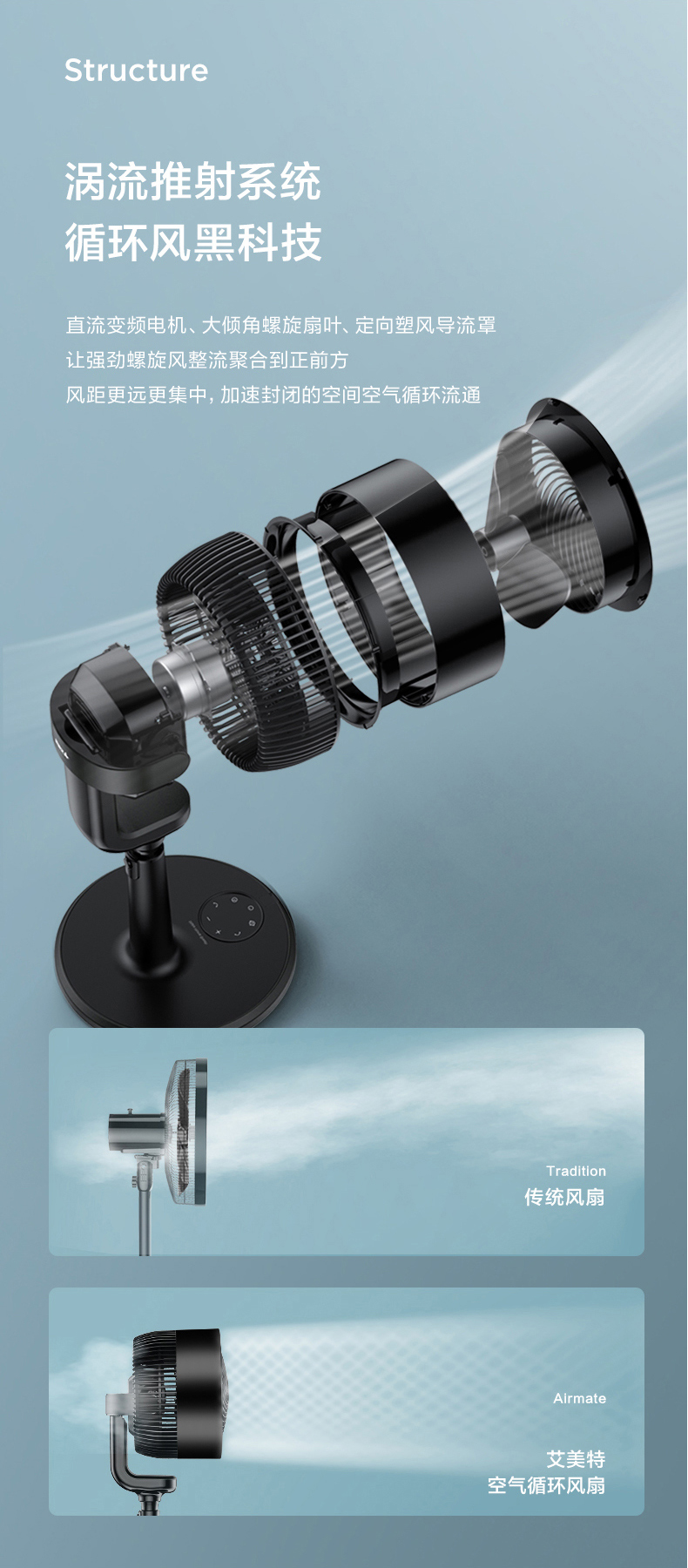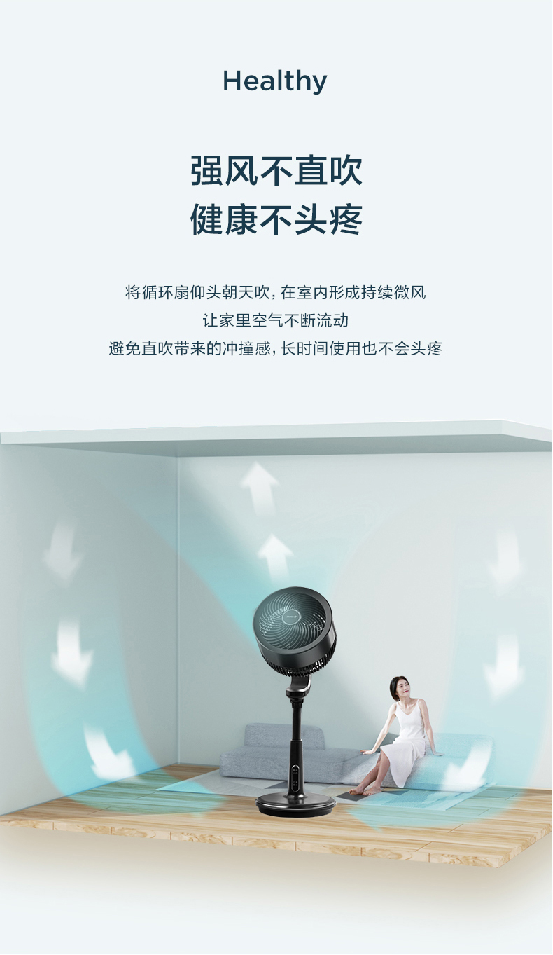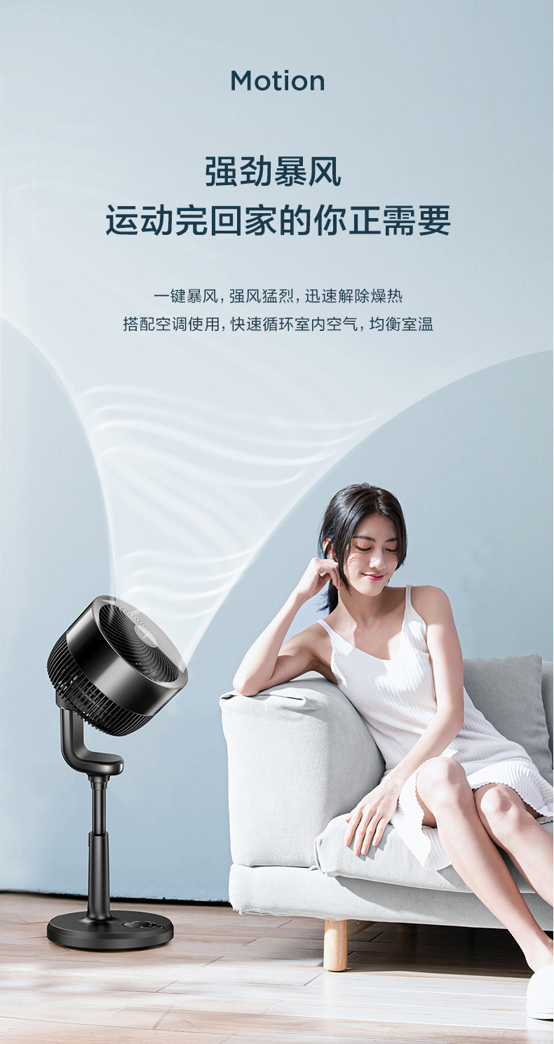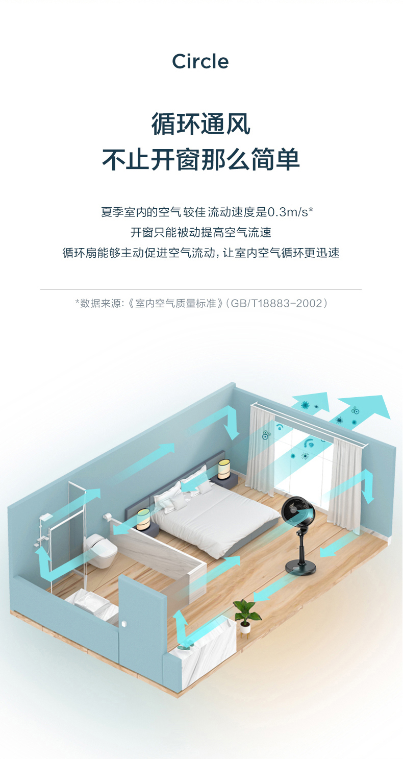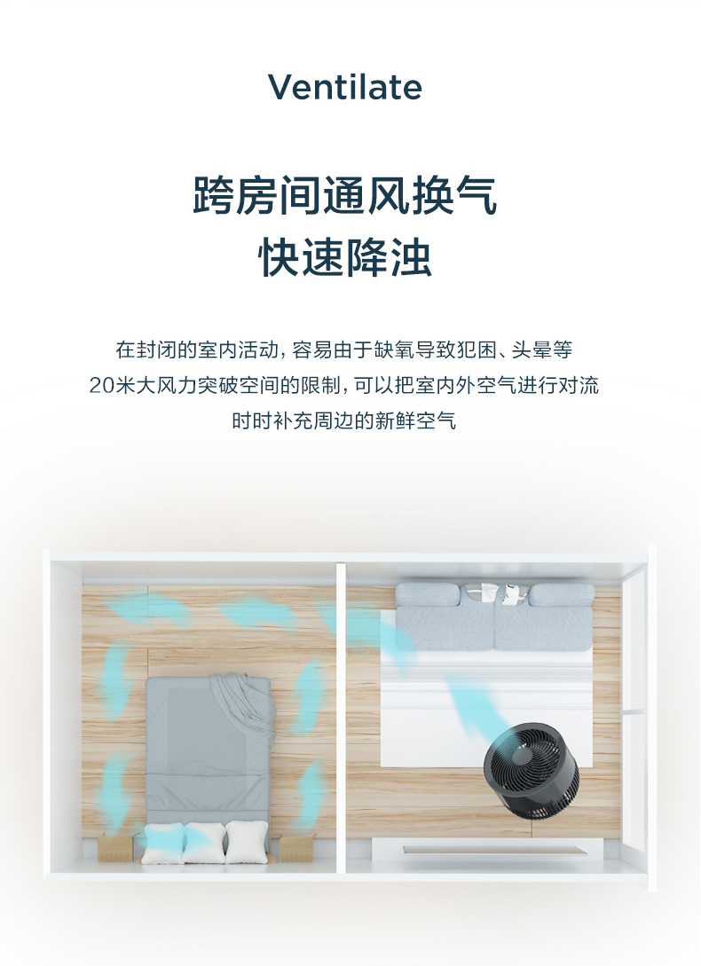 参考潜艇螺旋桨设计的大倾角螺旋扇叶,搭配空气动力学设计的聚风导流罩,可形成集中的涡流风束,实现更远距离传送,有效提升送风效率,加速空气循环流通。经SGS风距检测,最大风力可突破20米风距,20平米房间循环一次仅需2分钟。
