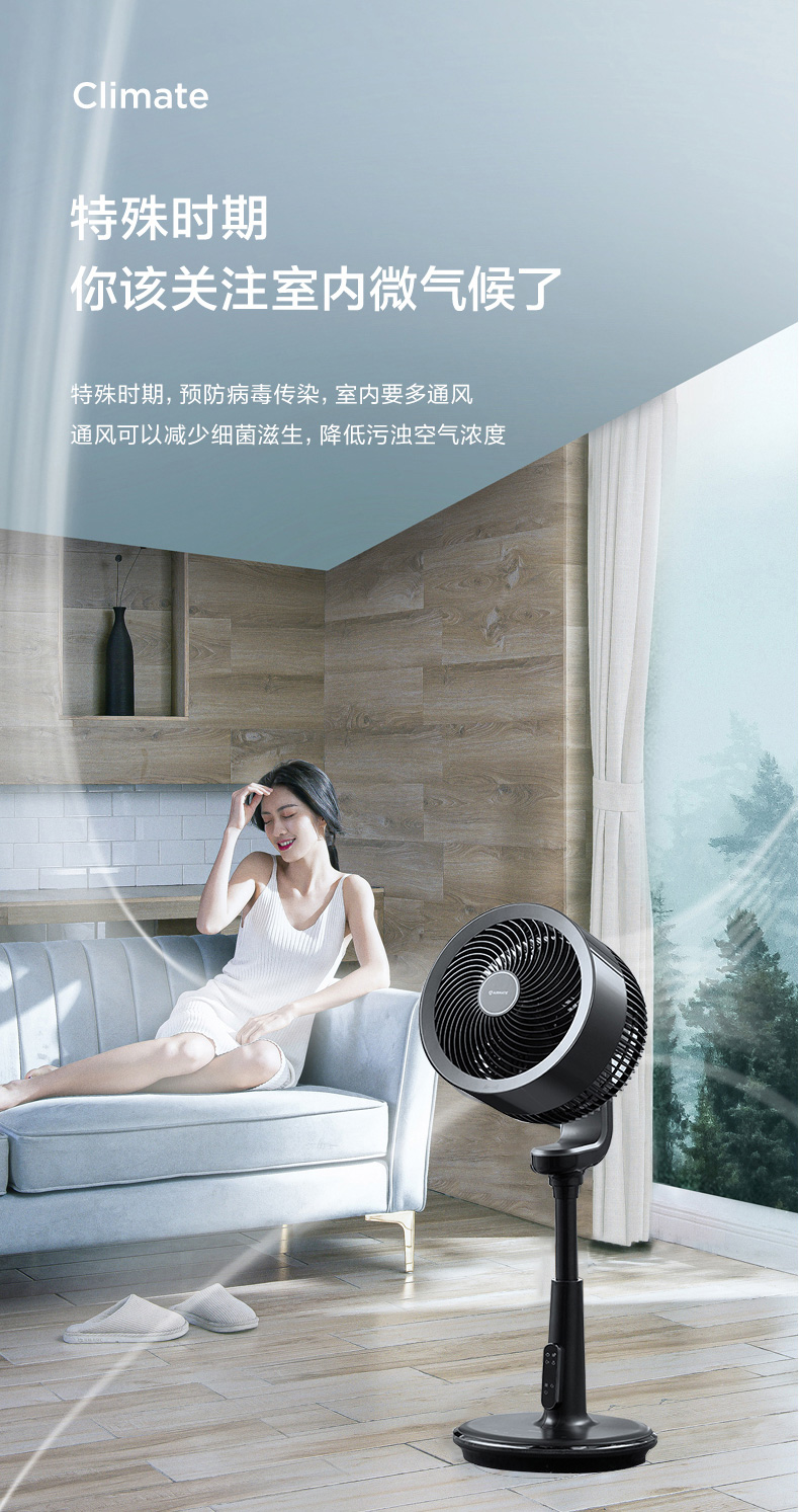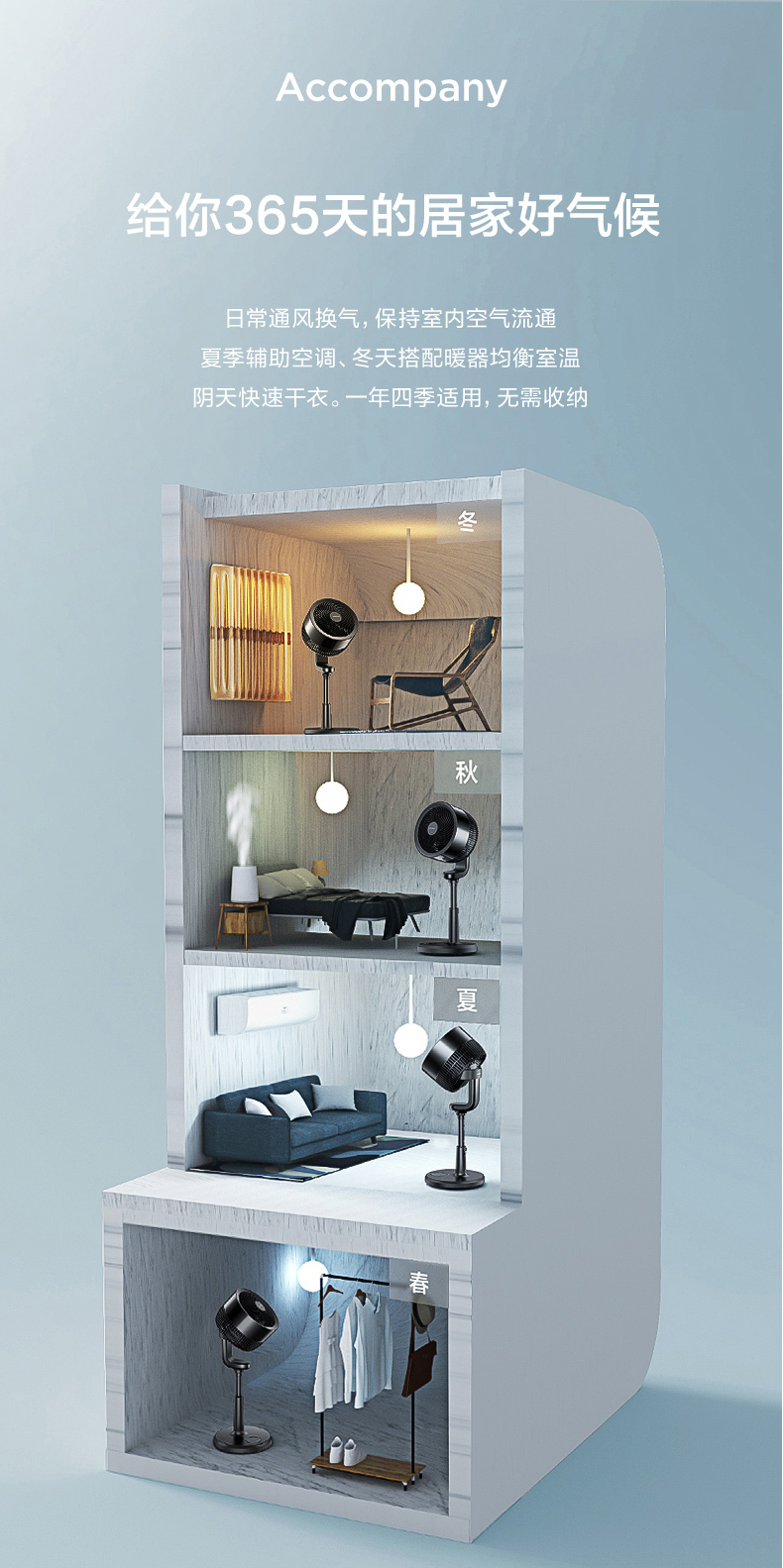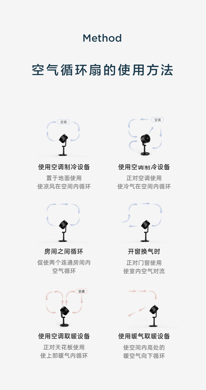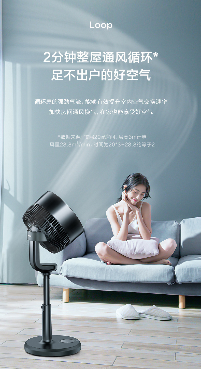 参考潜艇螺旋桨设计的大倾角螺旋扇叶,搭配空气动力学设计的聚风导流罩,可形成集中的涡流风束,实现更远距离传送,有效提升送风效率,加速空气循环流通。经SGS风距检测,最大风力可突破20米风距,20平米房间循环一次仅需2分钟。