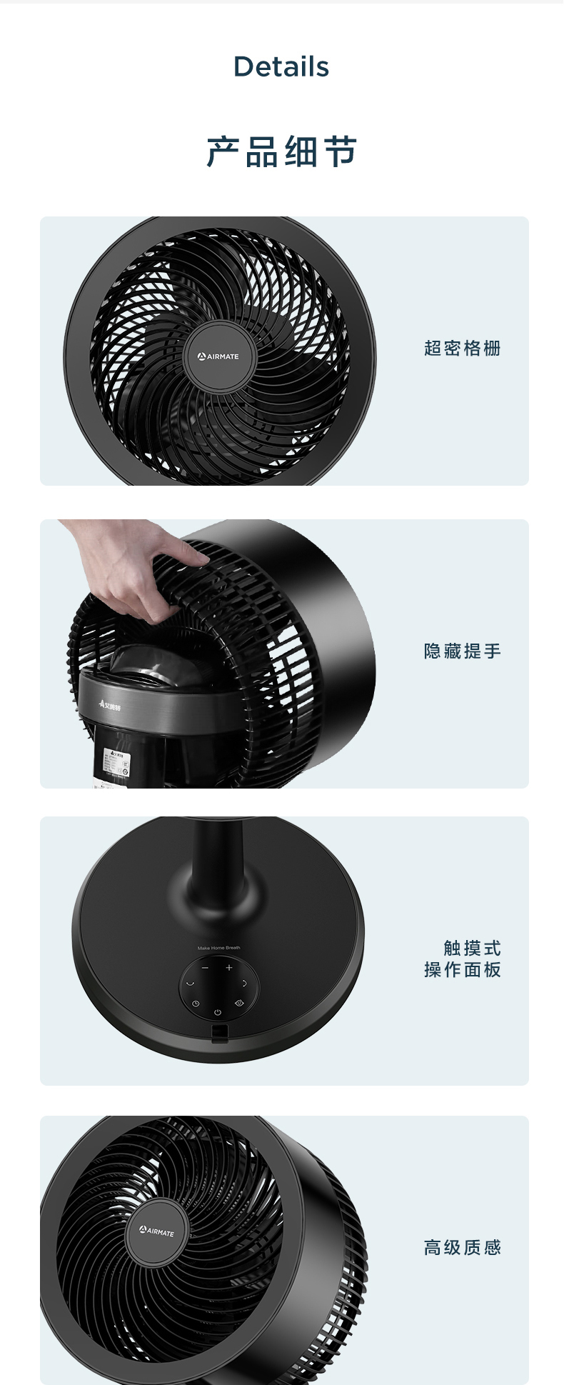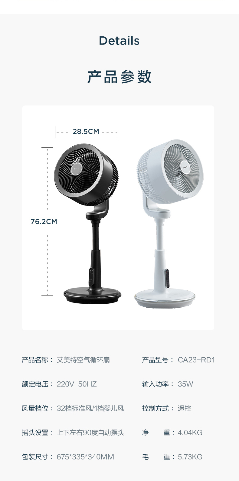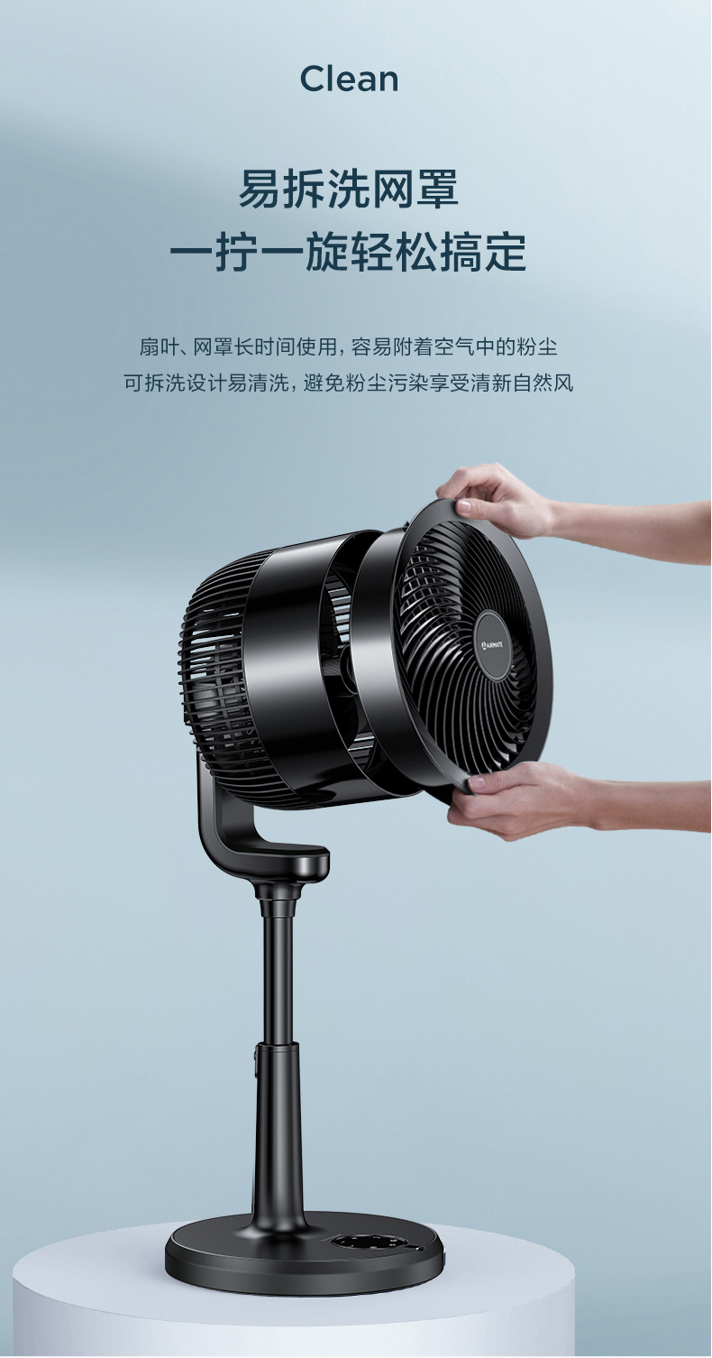 细节上:可左右30度、60度、90度自动摇头,上下90度自动摆头,也可3D混合旋转(注意:不要用手掰动方向),共有32档风速,另外伸缩立杆可调节高度,满足不同人群、环境使用需求。