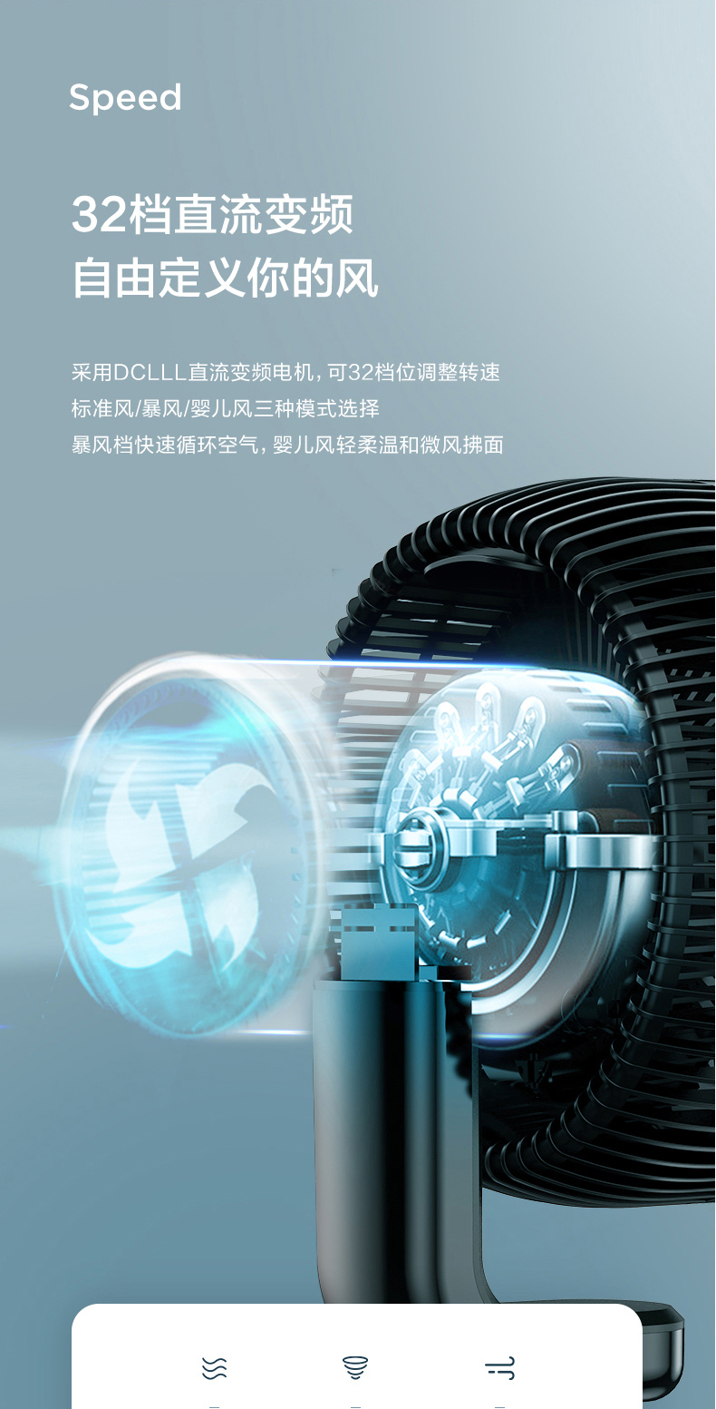 采用DCLLL直流变频电机,有32档风速可调,即使在低转速下也能保持平稳减少抖动。在循环整屋空气的同时,涓涓的细风、柔和自然风、呵护的婴儿风、强劲的暴风、诠释风中变化的细腻。特别适合对空调敏感人群。