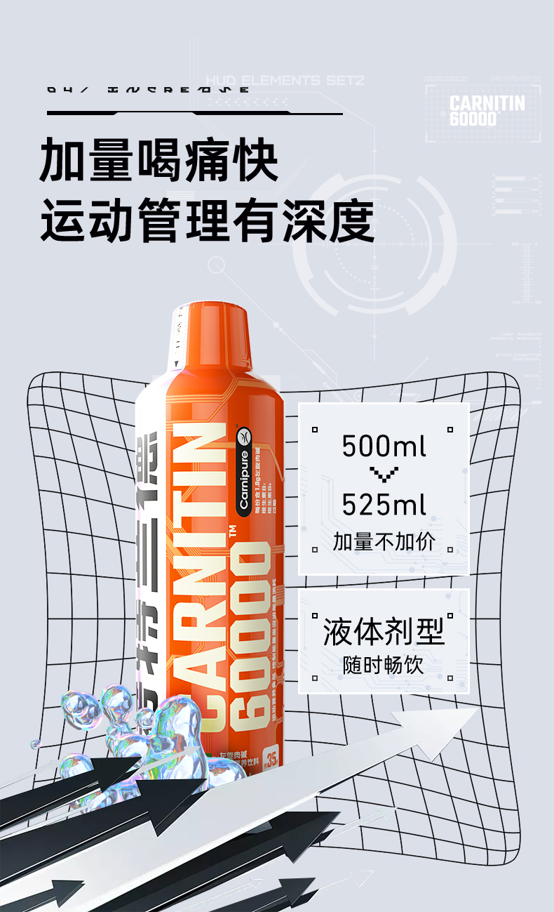 每10ml含有1200mg左旋肉碱,纯度高达99.99%,同时人体的吸收率也达99%,0糖分,0热量,0咖啡因。维生素B族协助脂肪在线粒体中分解燃烧;柑桔提取物能加速代谢,深层瓦解顽固部分,有效抑制食欲,预防能量过剩。