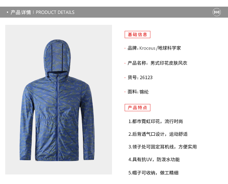 在款式上,一体连帽设计,腋下有专门的透气孔,弹力松紧袖口和下摆防止漏风,YKK拉链,衣面上是清晰鲜明的印花。