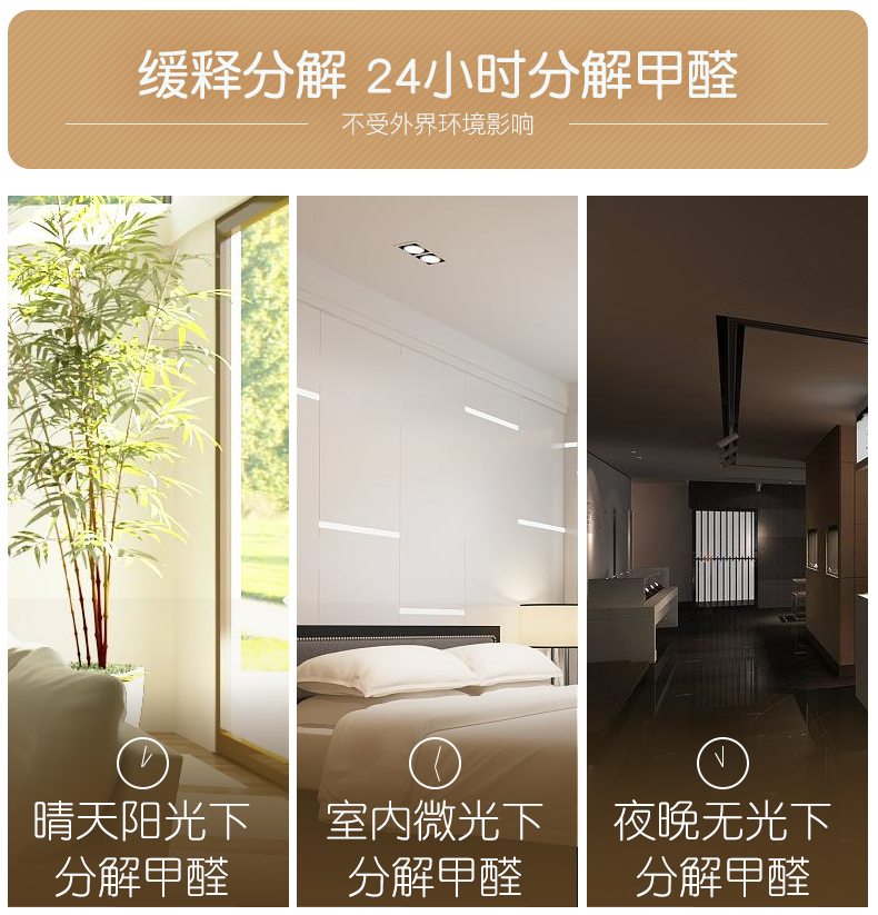 具有4大功效:1,强力去除甲醛,用缓释分解技术解决甲醛;2,分解TVOC,长效清除分解TVOC,防止二次污染;3,分解苯系物,非遮盖型,长期分解装修的挥发苯系物;4,去除难闻异味。