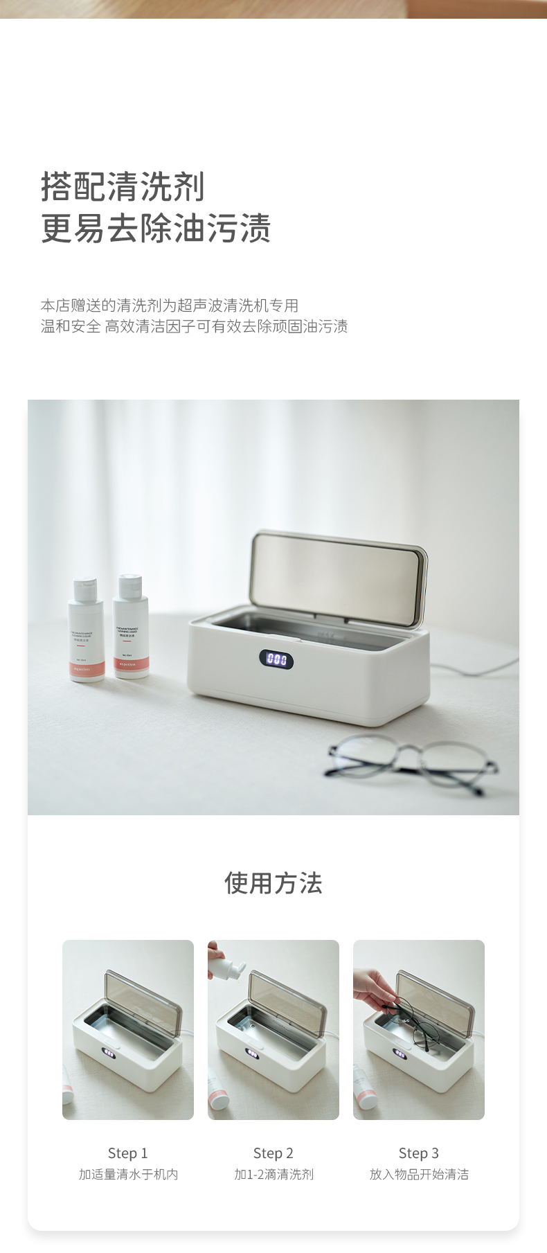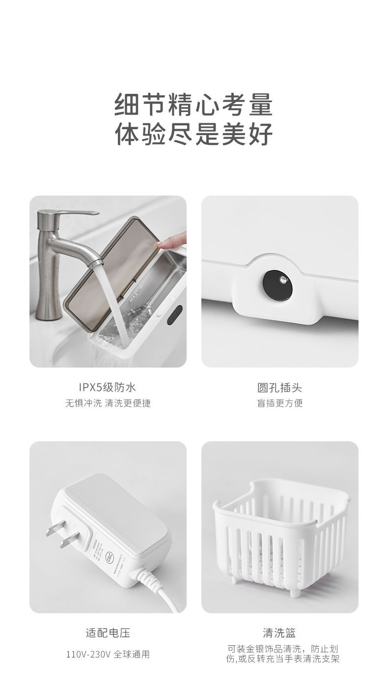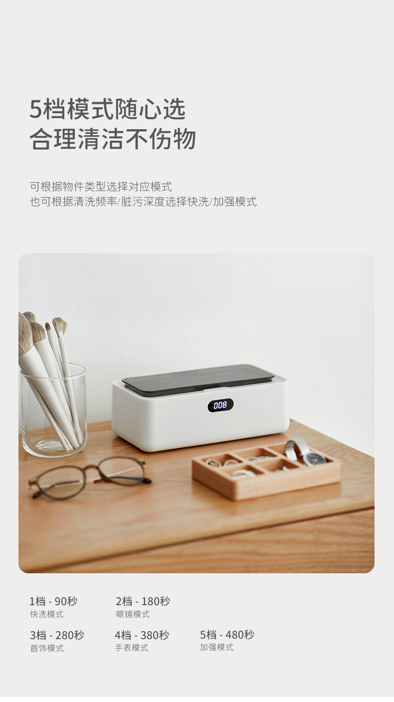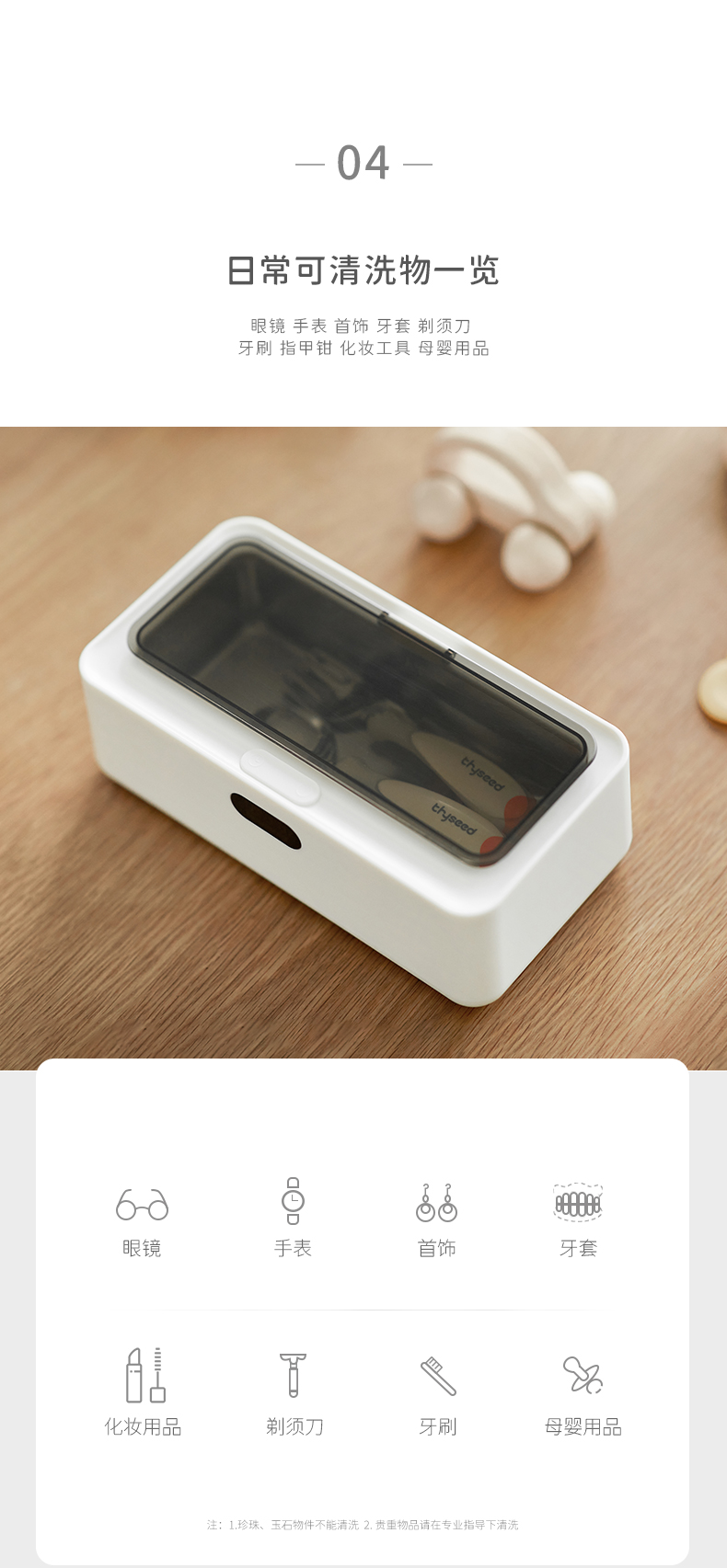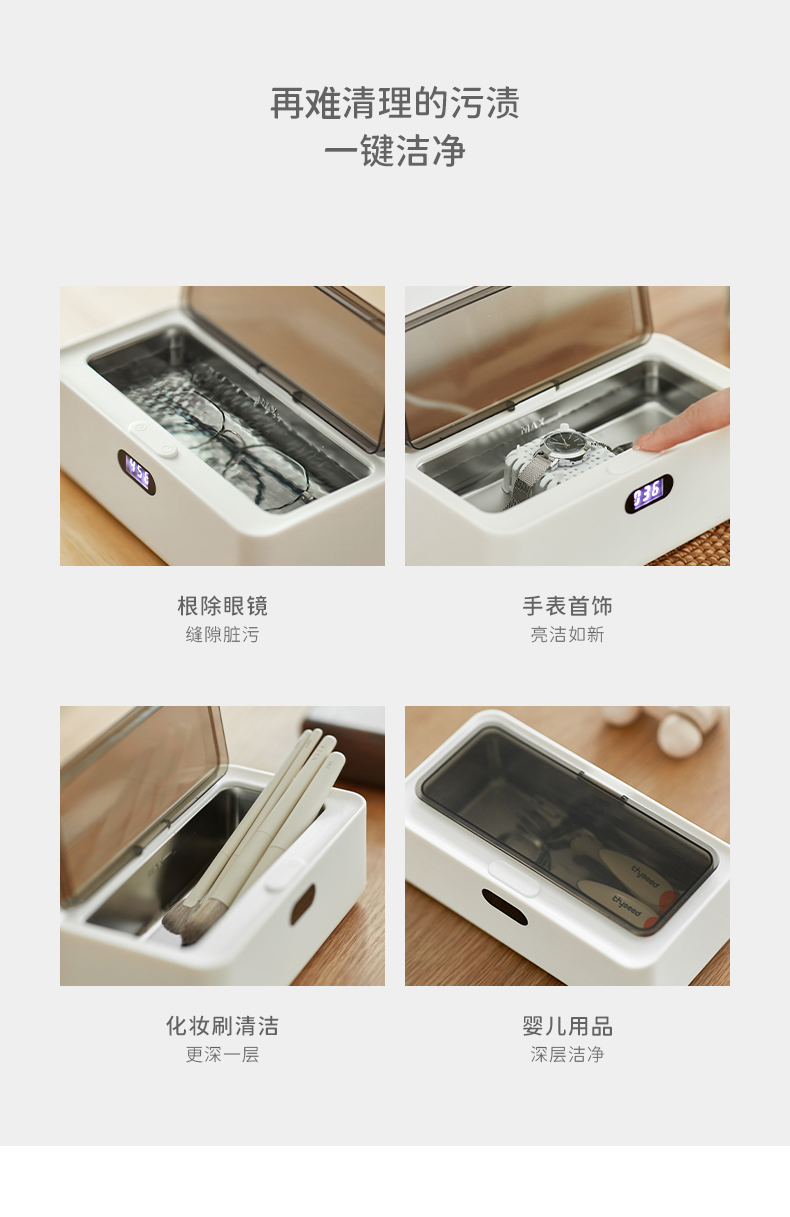 日常可用来清洗 眼镜、首饰、牙套、剃须刀、牙刷、指甲钳、化妆工具、母婴用品等。