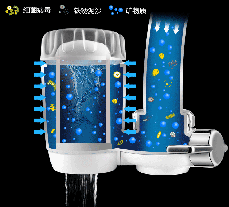 过滤精度可达到 0.1微米,有效滤除自来水中的泥沙、铁锈、胶体、余氯、异味等有害物质;带有可拆卸设计,滤芯表面脏污情况严重的话可以拿出用砂纸打磨,之后依然可以继续使用。