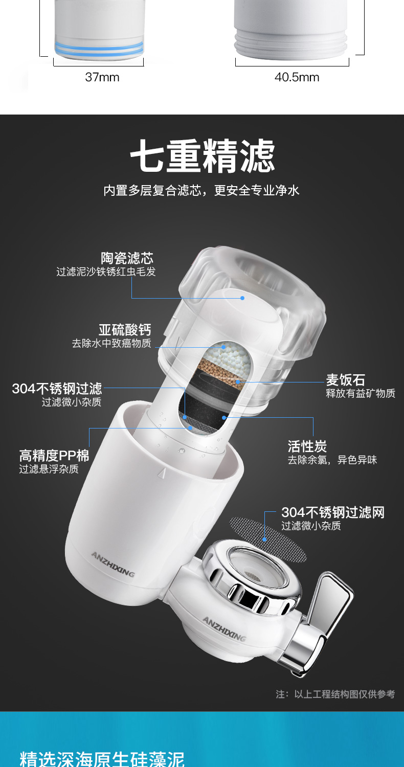 这款安之星 厨房净水龙头净水器,7层精密过滤,滤芯可清洗。有原水、净水、花洒3种出水模式,应对不同场景。采用天然硅藻泥陶瓷、亚硫酸钙、KDF抑菌金属簇、麦饭石天然矿化球、高精PP棉、椰壳活性炭、不锈钢滤网制作而成。