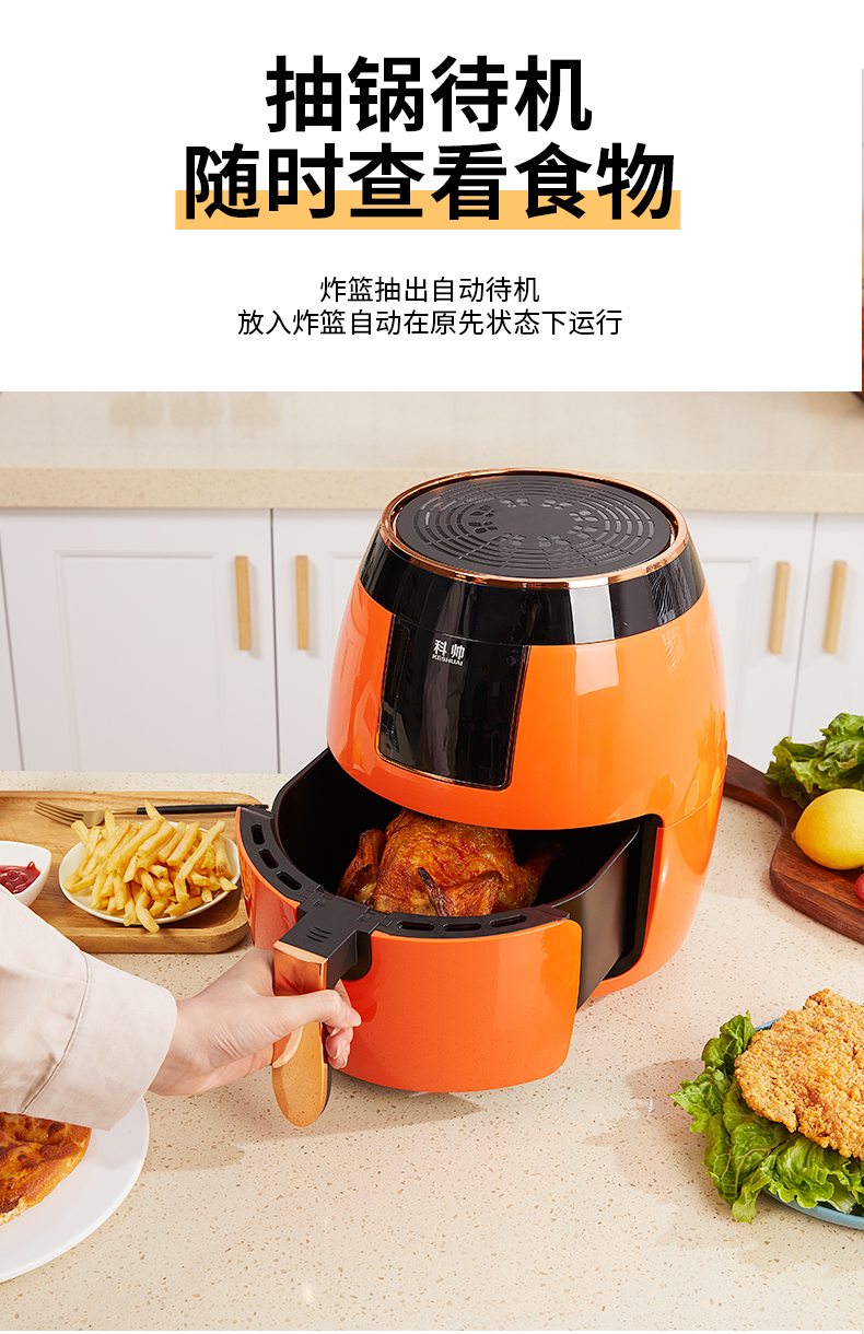 内腔是一体式设计,炸篮和炸锅运用分离技术,一体隔热手柄,抽拉更安全,食品级不粘油涂层,易清洗不易脱落,锅内容量是5.5L,可炸整机,一次制作满足全家食用。