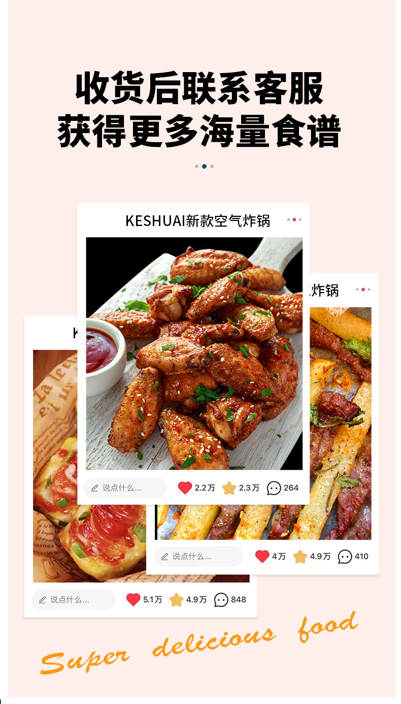 空气炸锅适合烹饪各种肉类、薯条、蛋挞(某宝上可直接买坯子 蛋液)。也可加热买来的外卖熟食,如 披萨、香肠、猪蹄、面包片类之类的,还是很方便的,也是厨房中实用比较高的厨具。