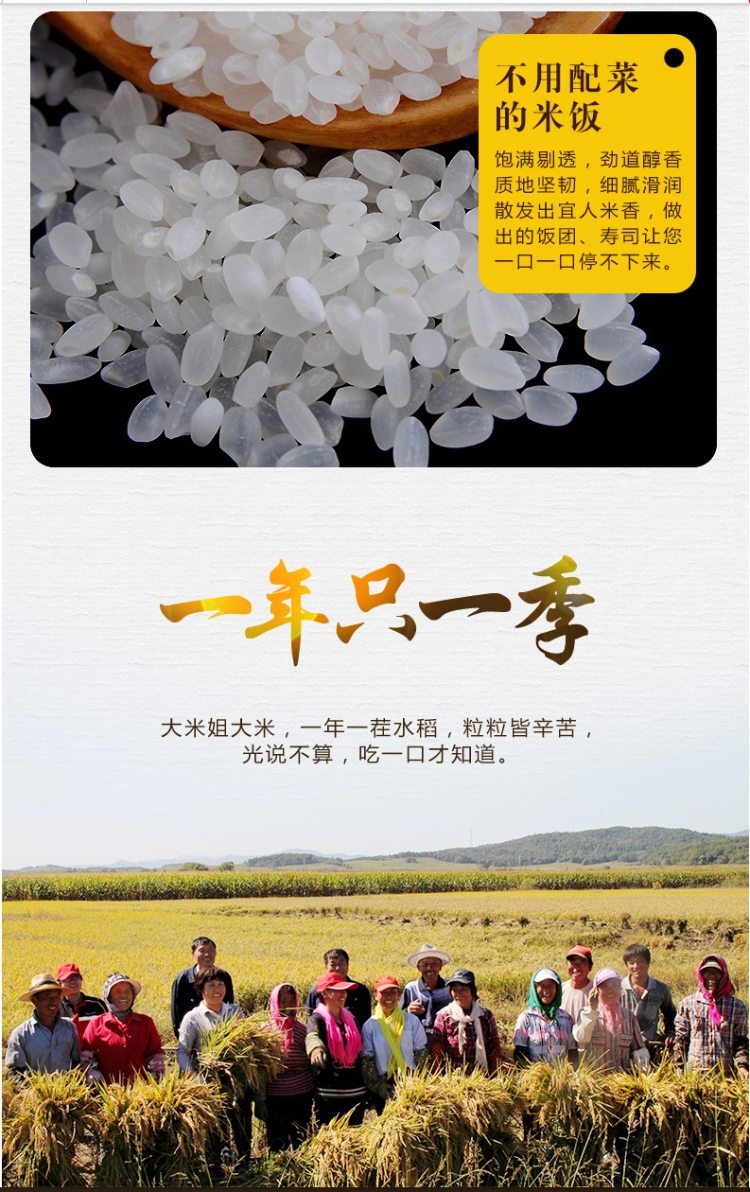 大米颗粒饱满,大小均匀,色泽洁白,晶莹透亮,煮熟后的米饭,质地坚韧,细腻滑润,不仅适合当米饭吃,更适合做寿司、饭团使用,回味有甘甜,冷饭不回生。