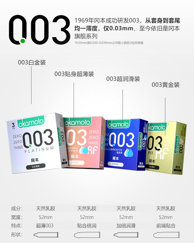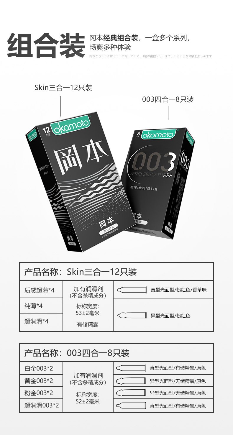 这款冈本 超薄003安全套,日本原装进口,包括Skin 激薄 5+Skin 润滑10片,共15片。