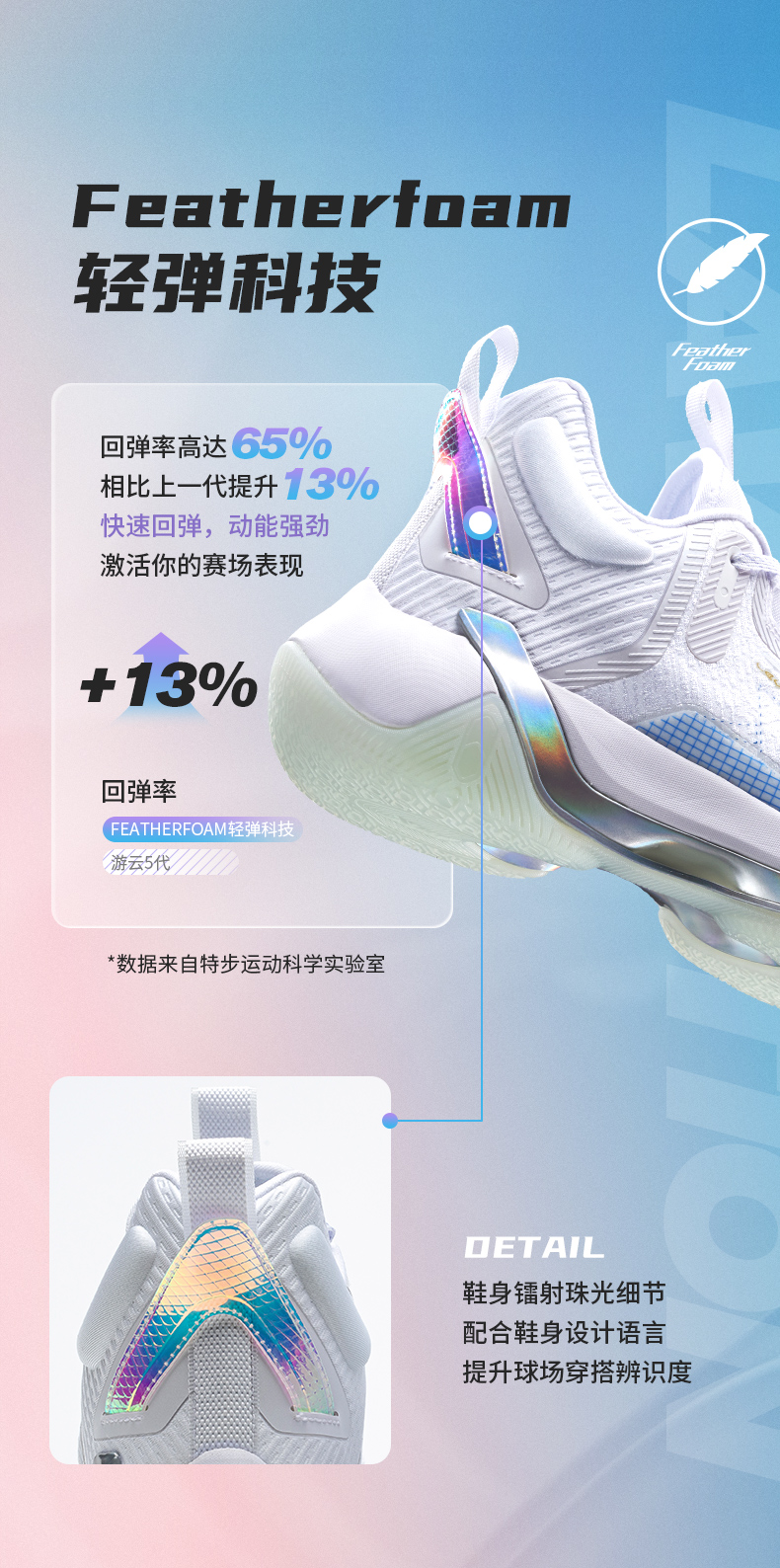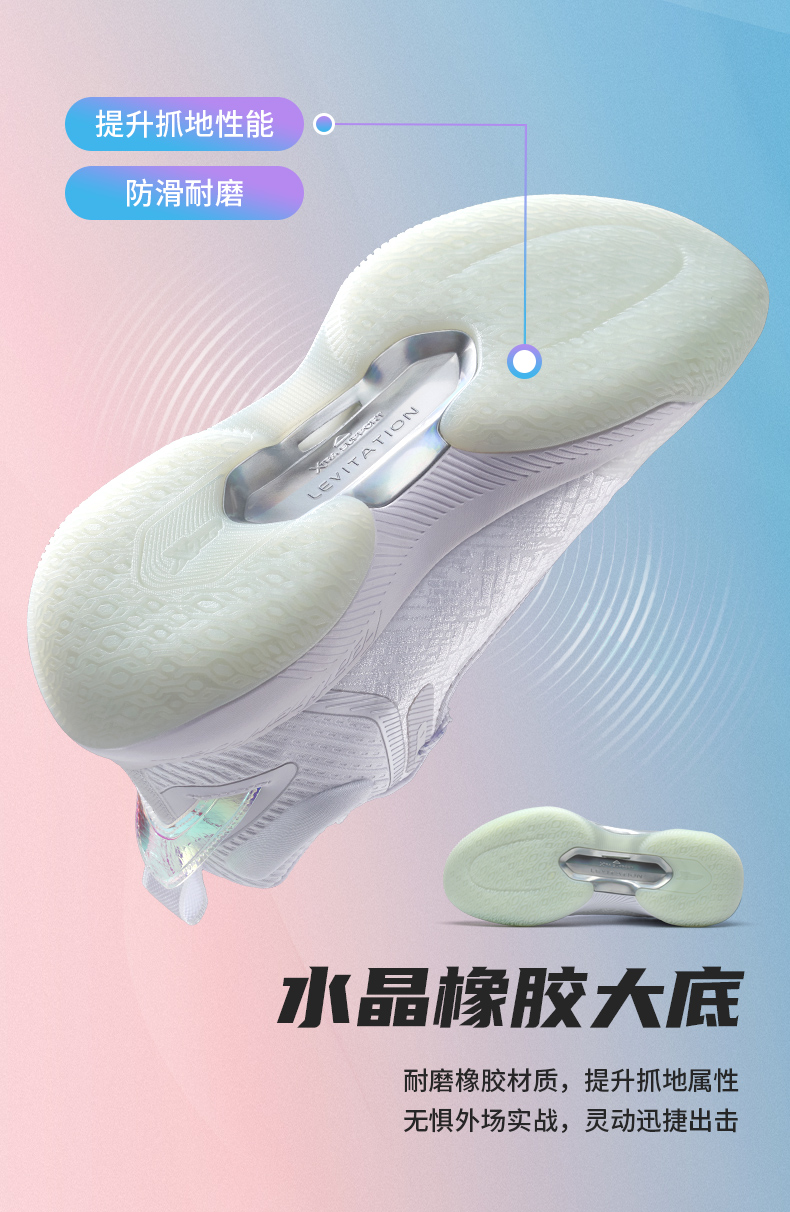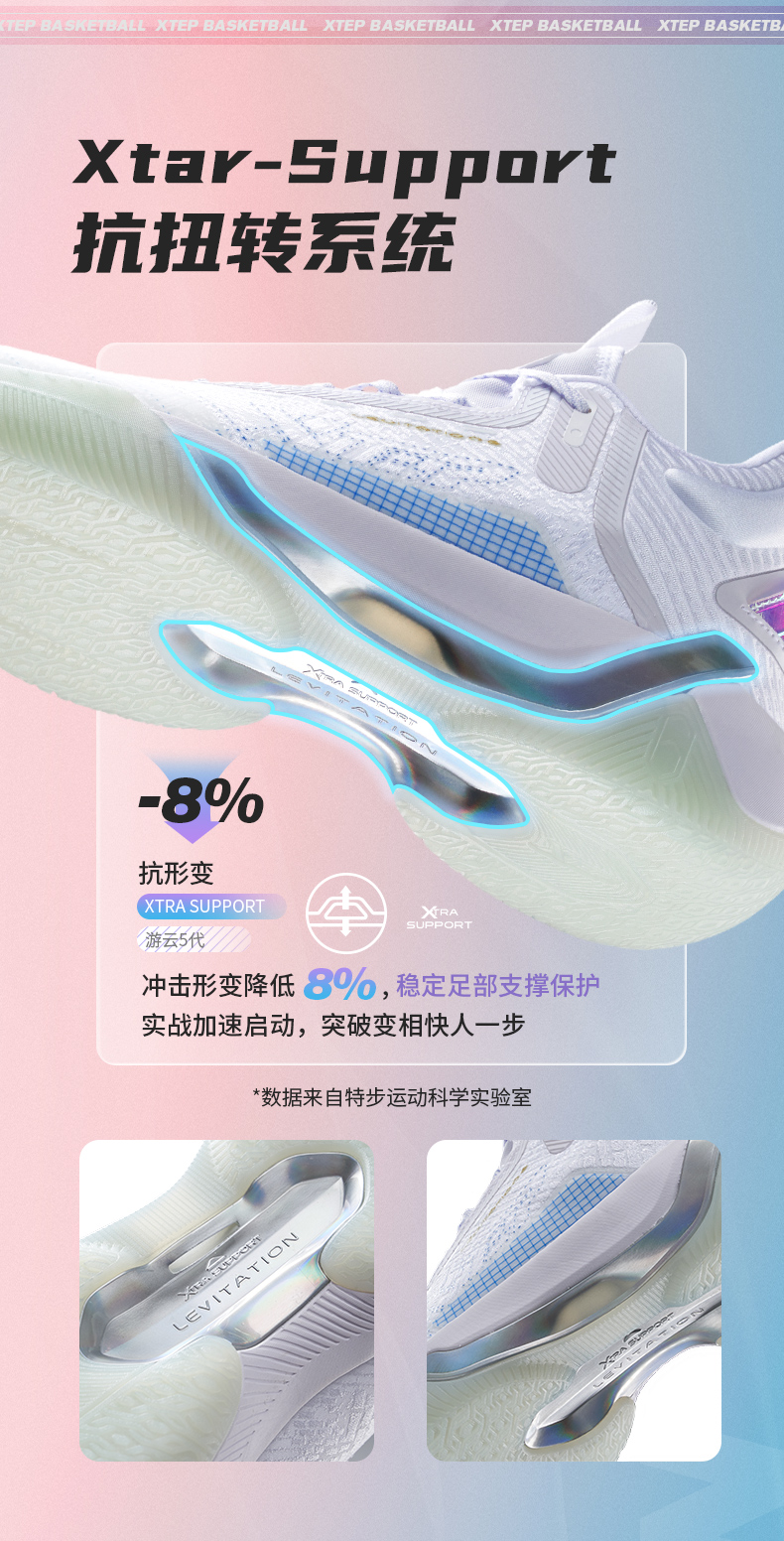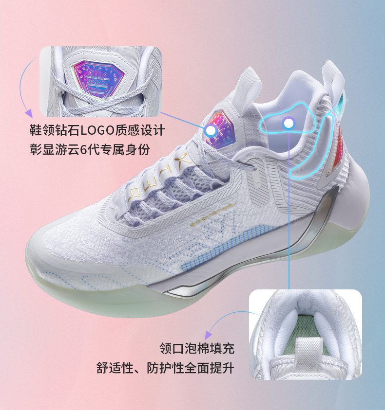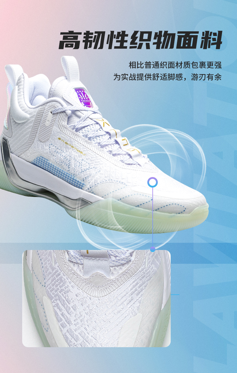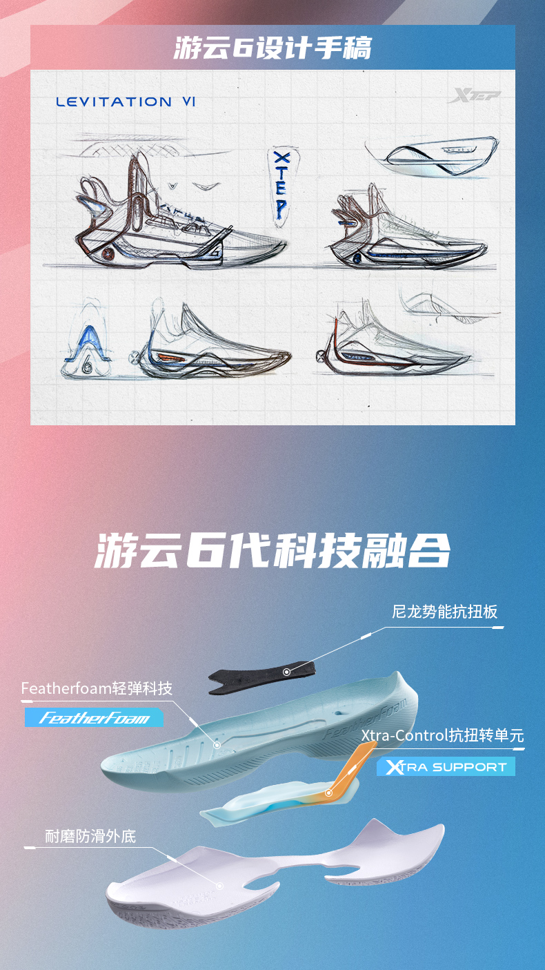 XTEP 特步 游云6代男子篮球鞋,高韧性织物面料,相比普通织物材质,可以提供更舒适的包裹感。全掌前后贯穿式TPU材质,提供优异的支撑性能。中底采用全掌“动力巢”科技材质,对比普通EVA可降低40%能量衰减。水晶橡胶大底,提升抓地力和耐磨性能,穿着灵动更迅捷。