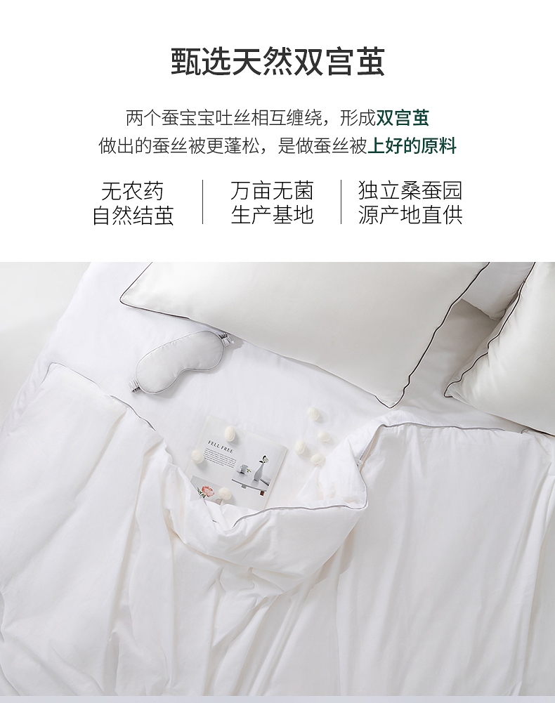 此款蚕丝被填充的是桑蚕丝中顶级的双宫茧蚕丝,因为产量稀少,价格相对高一些。产自苏州核心产地太湖雪自有种植园,纤维长度单茧可达1000米长度,不管是蓬松度和舒适度都远超普通蚕丝,保暖度和寿命都很高。全过程无污染拉网制被工艺,通过选蚕、铺层、定位、质检等层层审核制作而成,具有轻、柔、细的特点。