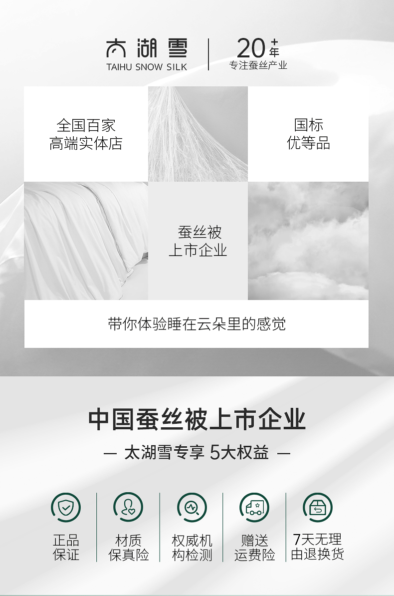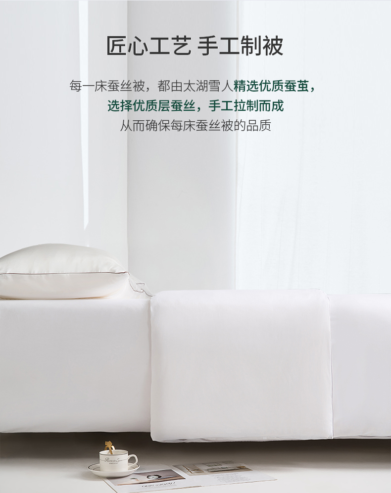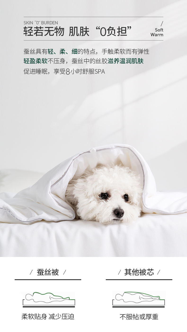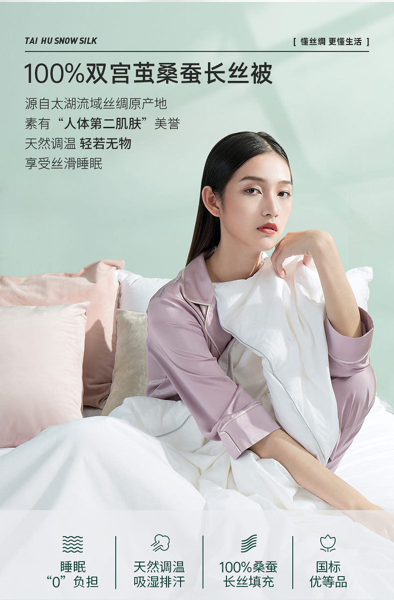蚕丝具有“纤维皇后“之美誉,天热的适合舒适透气,天冷的时候保暖;桑蚕丝含有的氨基酸,因为和人体皮肤接近,对皮肤还有保养功效。在好的亲肤性、舒适性、保暖性的前提下,不管是对于婴幼儿,还是对于老人、成人的睡眠而言,都能提升不少质量。