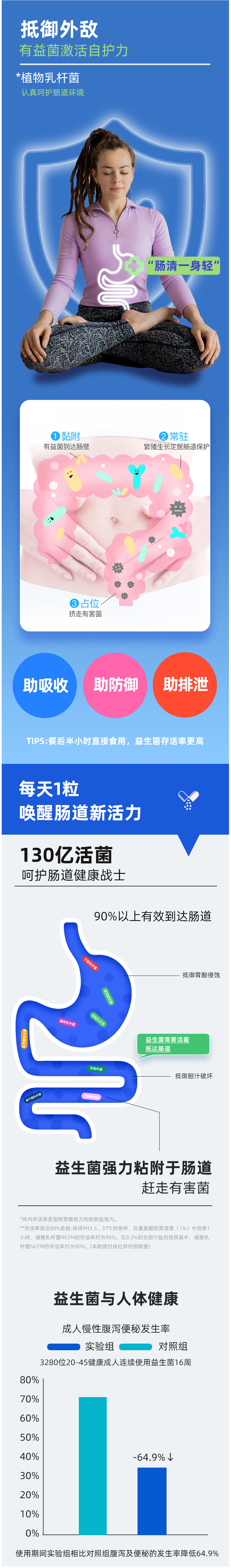 每粒含130亿活性益生菌,隔氧阻光PP袋包装,保持菌株活力,排出宿便,清理毒素,搞定多种肠道问题,唤醒肠道新活力!