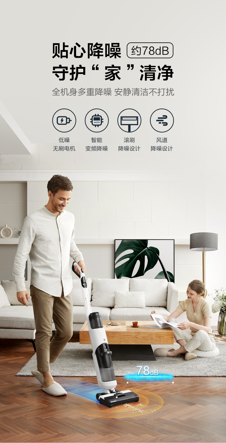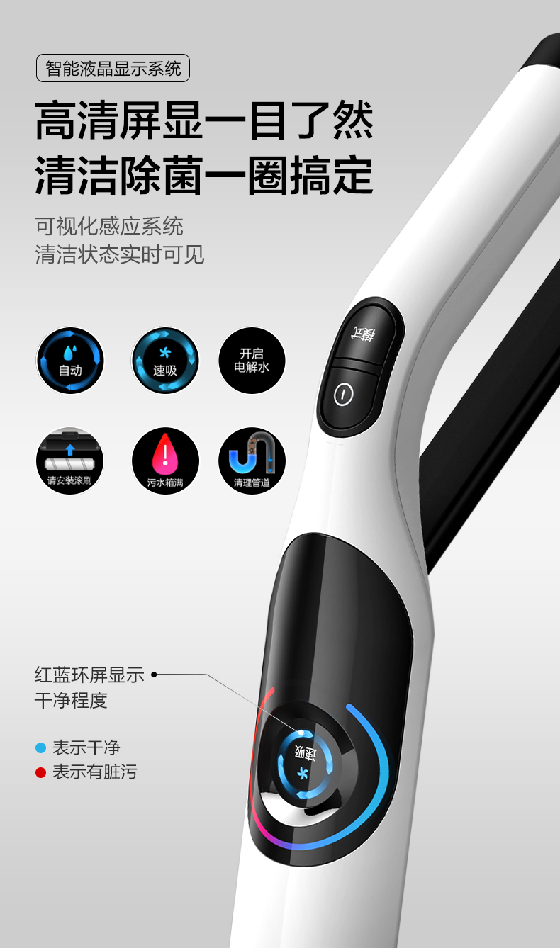 拥有智能感应自调节技术,使用过程中,它会根据感应到的污渍情况自动调节吸力大小,另外机身配备了智能液晶屏,红蓝环屏显示干净程度,清洁状态实时可见,也可以直观查看机器的工作模式、剩余电量、故障提示灯,智能、直观的交互体验让它可以轻松上手使用。