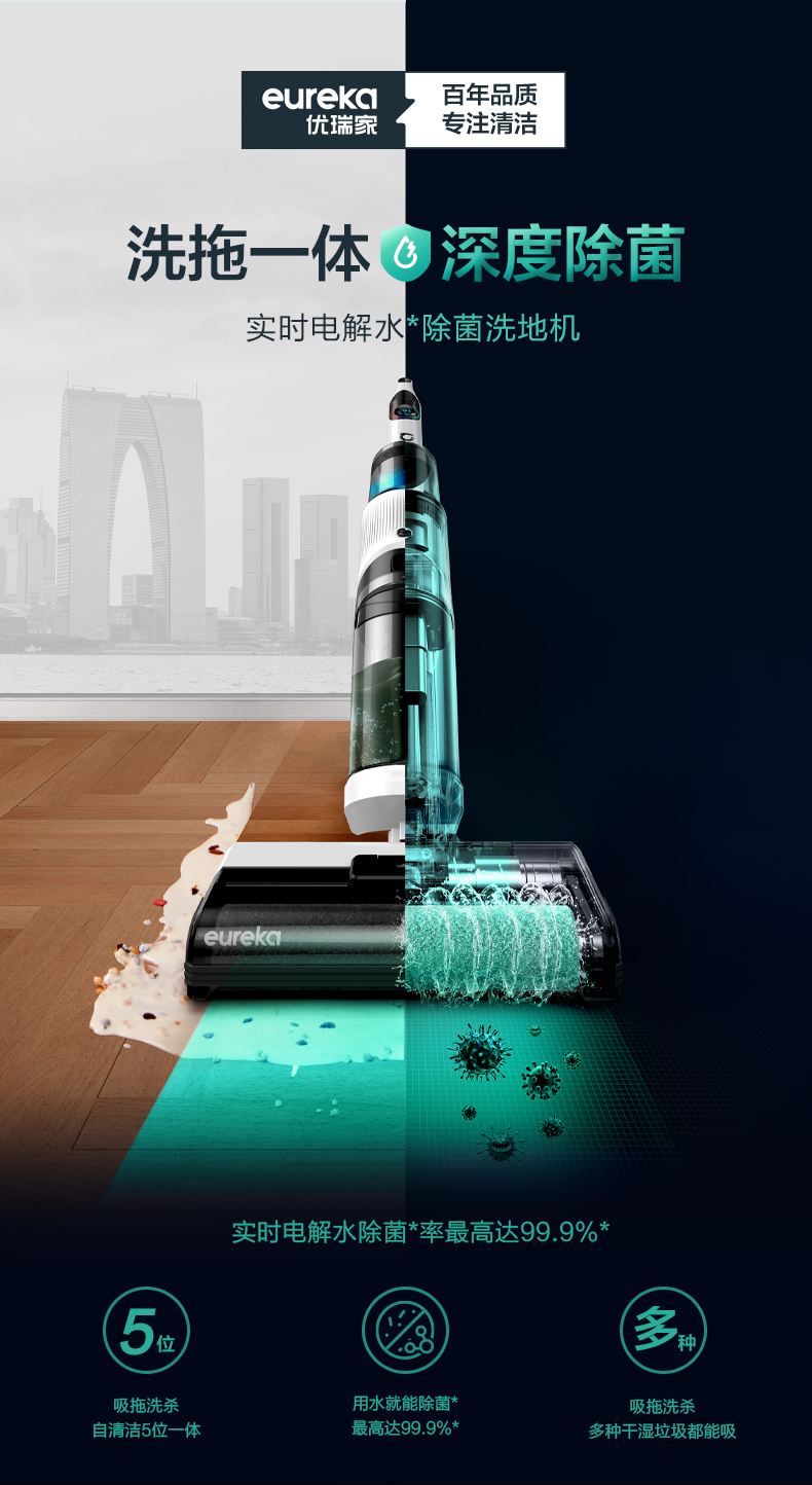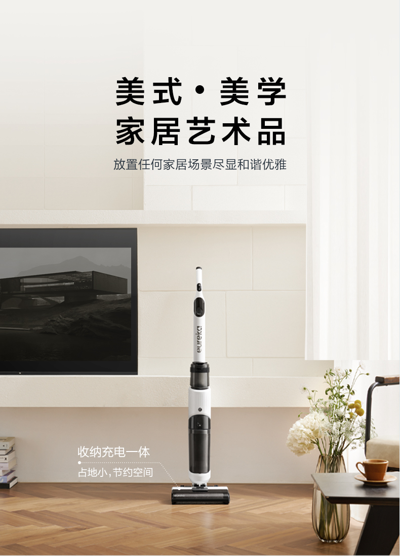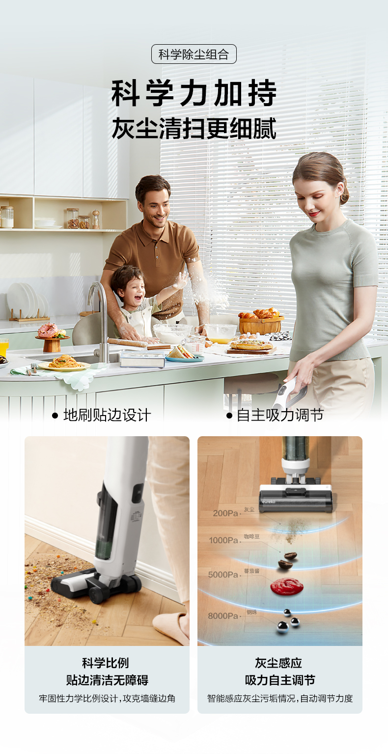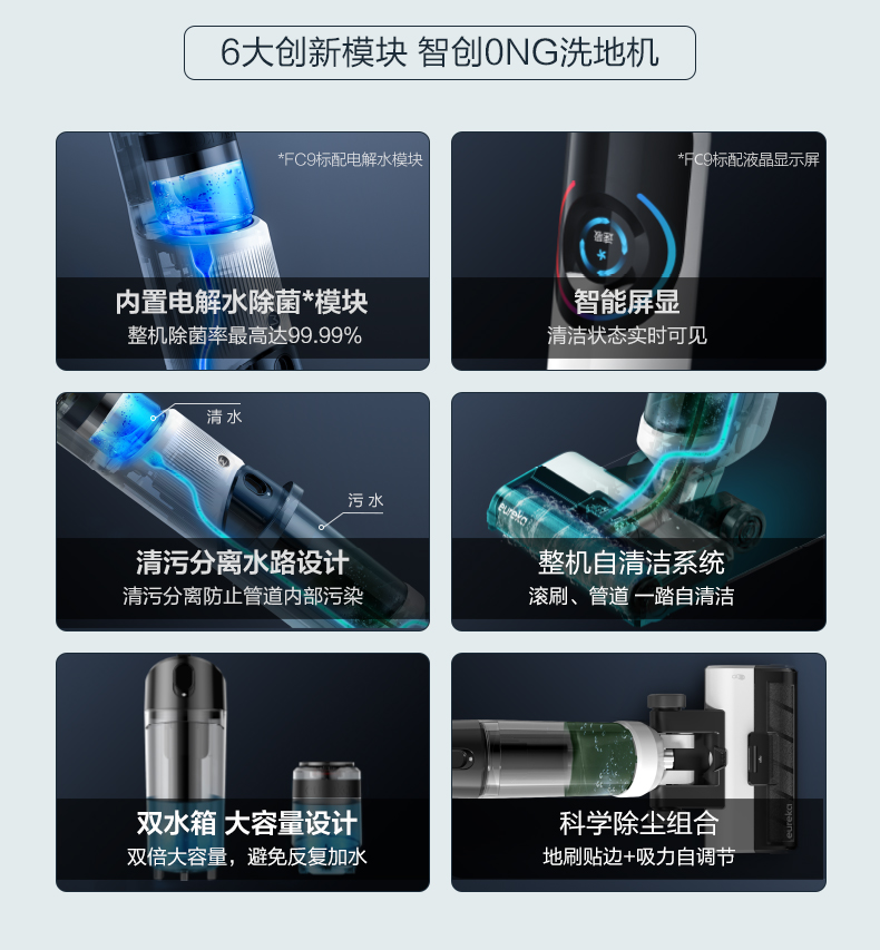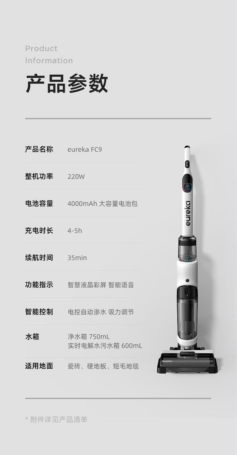 Eureka FC9洗地机,和常见的扫地机器人或手持吸尘器相比,洗地机的优势在于,集合了吸尘、拖地、洗地、除菌等多种功能于一体,能够同步实现多重清洁任务。适用于瓷砖、硬地板、短毛地毯等不同材质地面,干湿垃圾都能吸,而且可以应对一些顽固的污渍;为了更好的清理边角,地刷采用贴边设计,贴边使用时不存在清理死角。