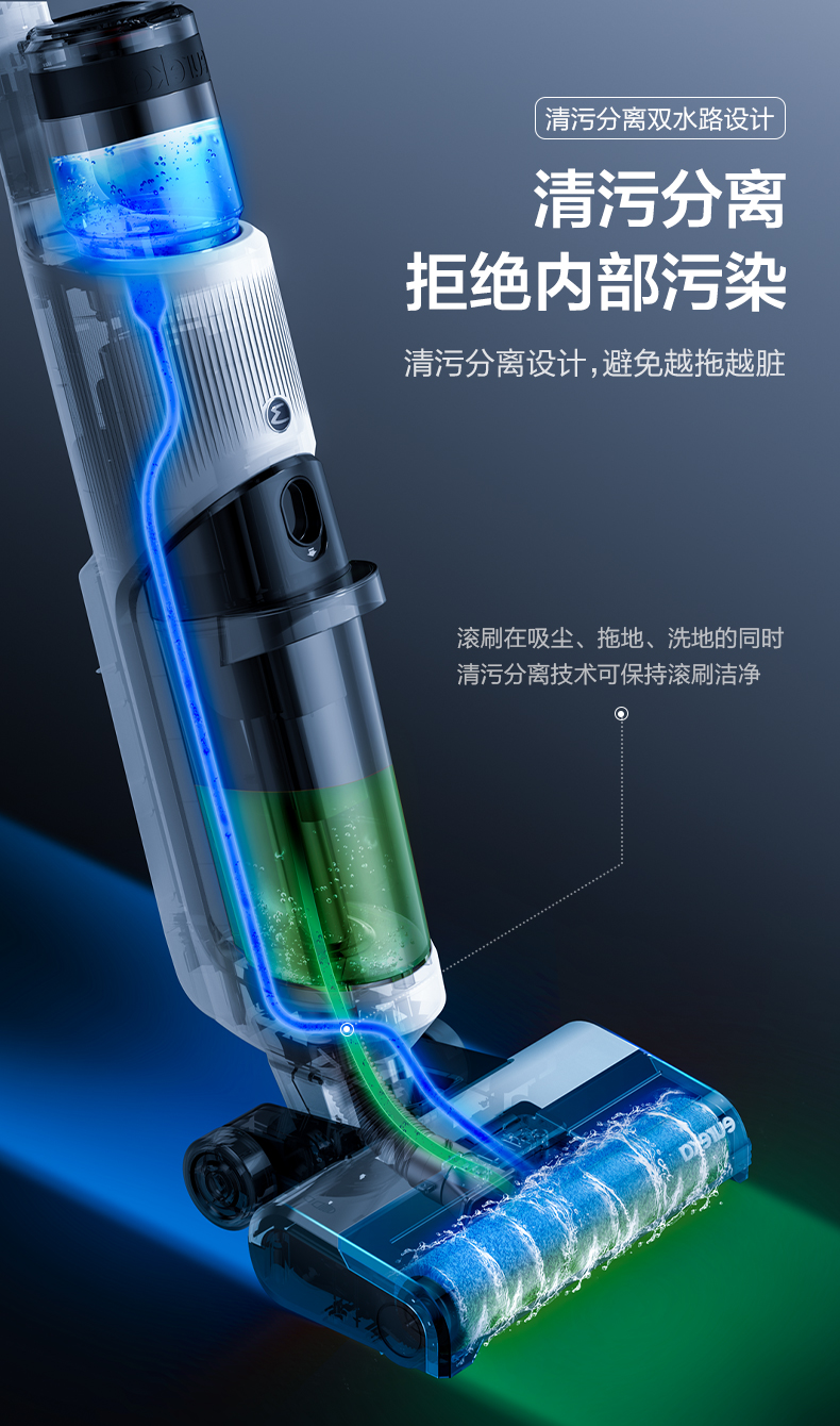 净污分离技术,吸尘、拖地、洗地的同时可保持滚刷及内部管道的活水清洁,避免越拖越脏。配备600mL污水箱以及750mL净水箱,一次加水即可满足全屋的清洁需求,另外4000mAh大容量可以提供充足的电量支撑,最长续航能力达到35分钟。