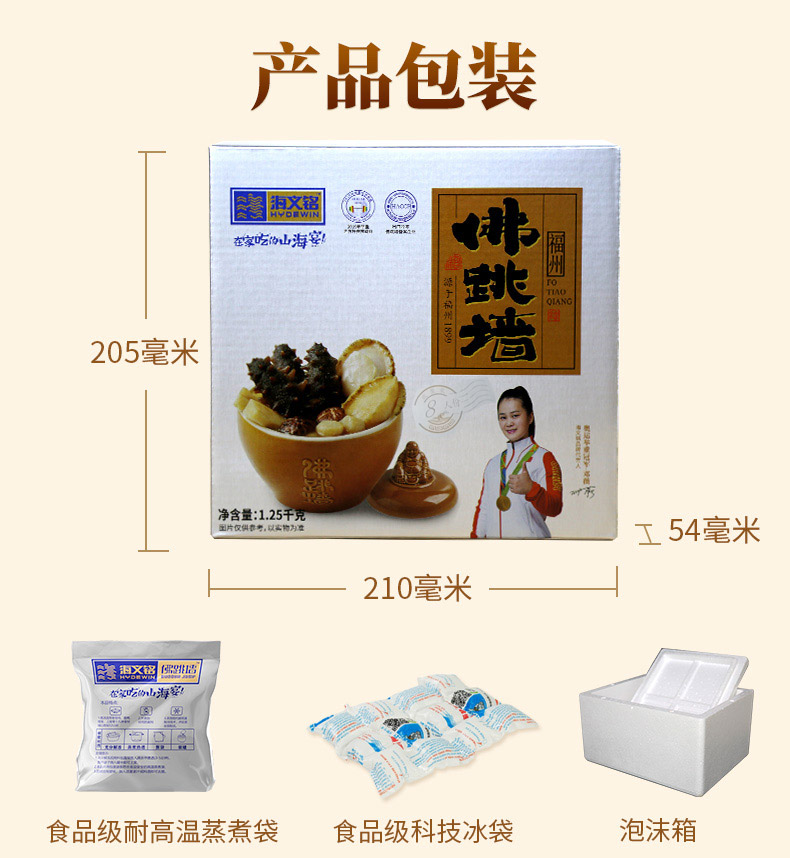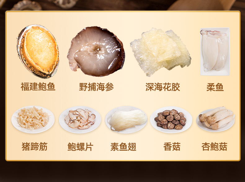 中国闽菜大厨王德官秘制,15种食材 24时文火熬制。包含:福建鲍鱼、海参、深海花胶、柔鱼、猪蹄筋、鲍螺片、素鱼翅、香菇、杏鲍菇等、加上精选散养士鸡、番鸭上排、筒骨、大腿骨、猪蹄、金华火腿、鸡爪等优质原料,慢火24小时熬制金汤,加热即食,营养滋补,无添加剂,食品级蒸煮袋装,加热即食非常方便。