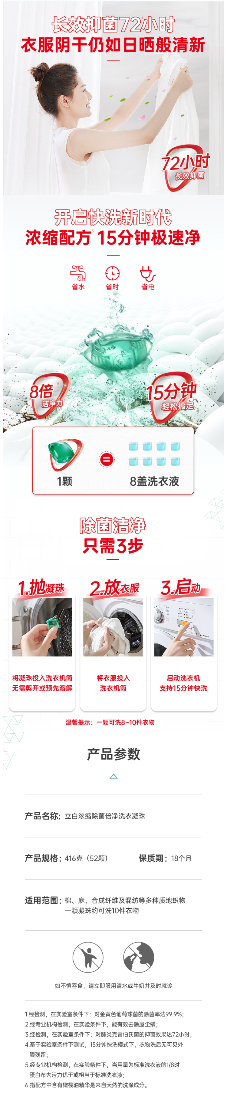 这款立白 天然倍净浓缩洗衣凝珠,专为机洗设计,植物活性剂配方,深层洁净,保护衣物纤维,水溶性外膜,低温也能溶解不残留,省心简单实用,8倍洁净力,99%除菌,高效去污,快洗无残留,洗后柔顺亮丽,清雅幽香,去除异味,留香悠长。适用于棉麻、混纺、合成纤维等质料衣物。