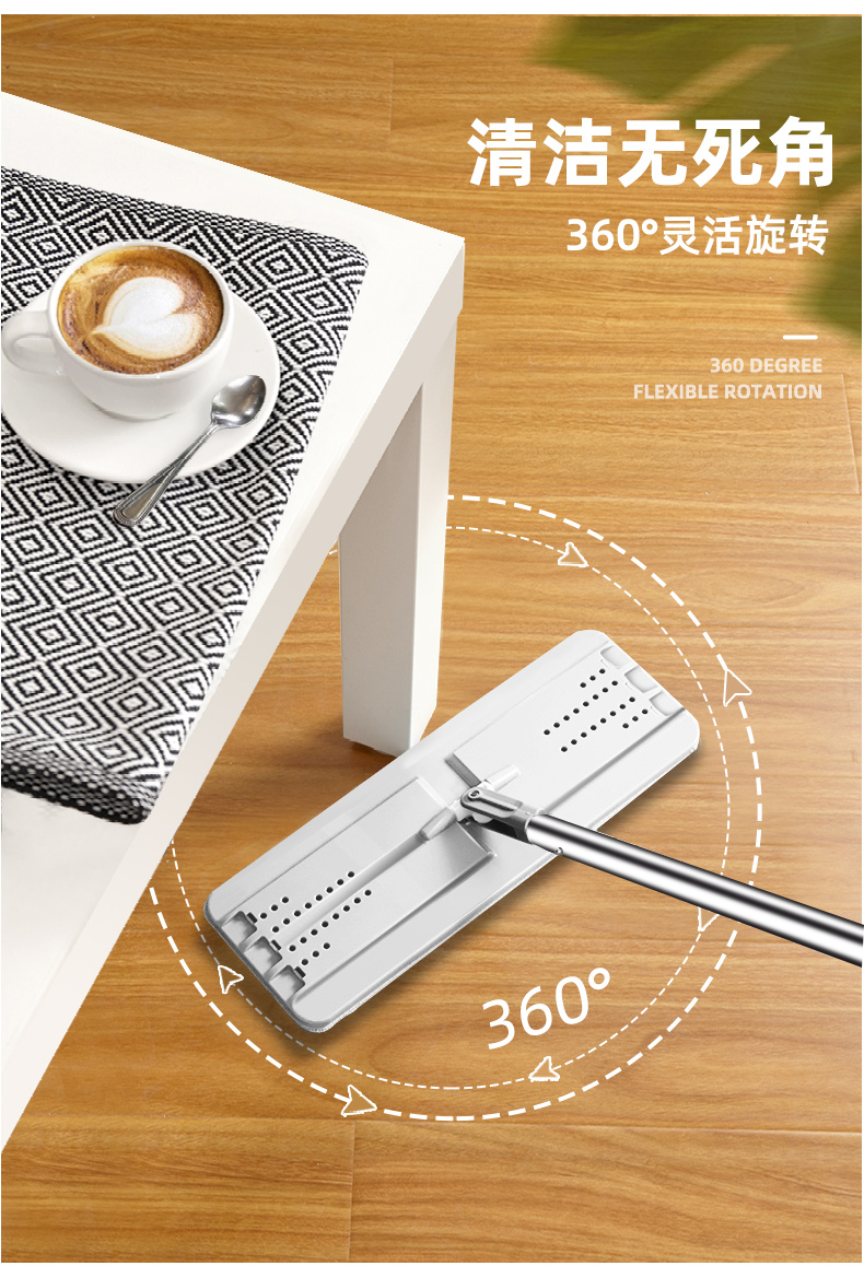 拖杆长达1.27m,配合省力滑轨,上下洗脱时无需弯腰更省力;拖把头可360°灵活旋转,可自由穿梭于家居底部。