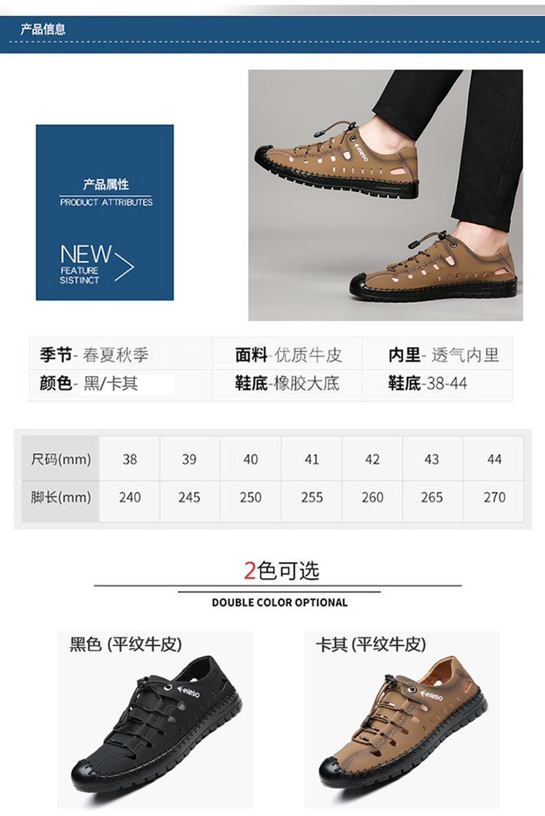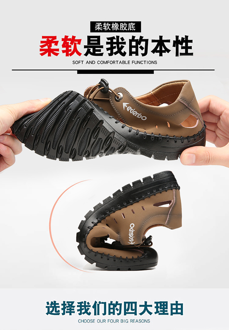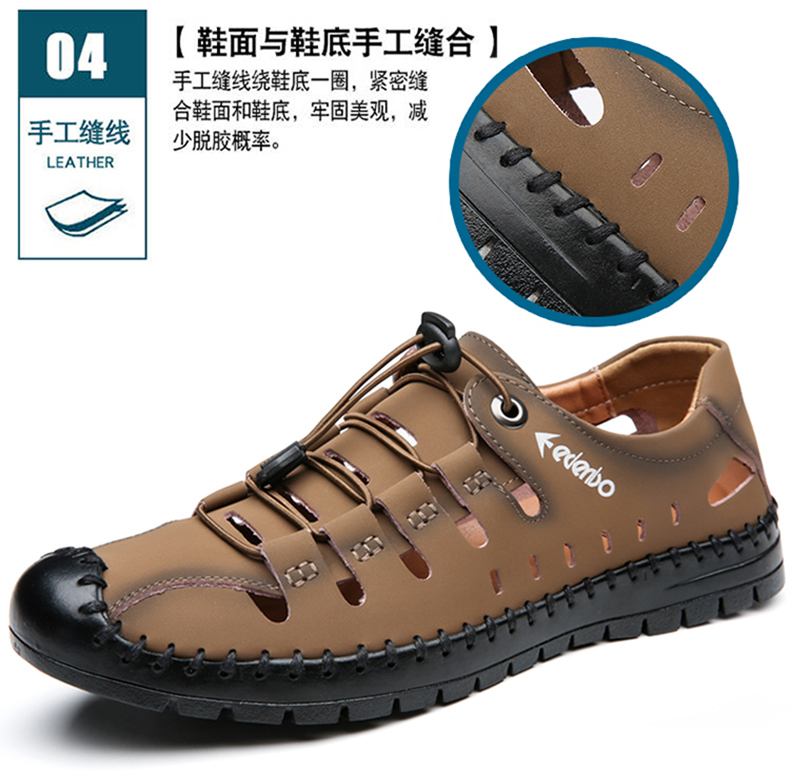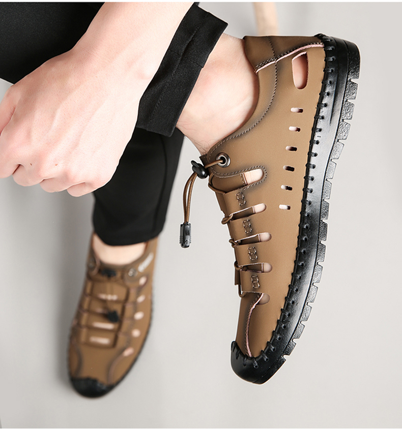 这款皮凉鞋,采用优质牛皮材质,质地细腻,柔软富有光泽,时尚洞洞设计,鞋面、鞋底手工缝线,更加牢固美观,海边涉水减少脱胶概率,松紧鞋带自动扣设计,包裹性好穿脱方便,橡胶大底,耐磨防滑,整体轻便,日常休闲、旅行穿着轻松舒适。