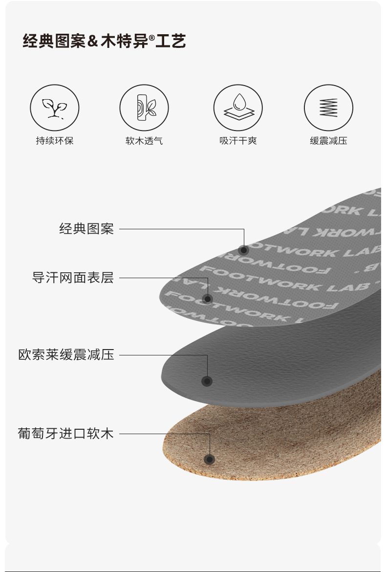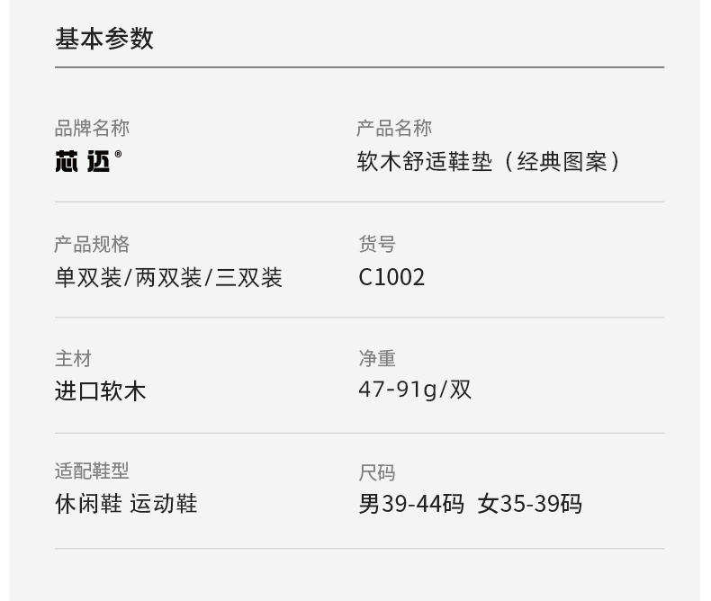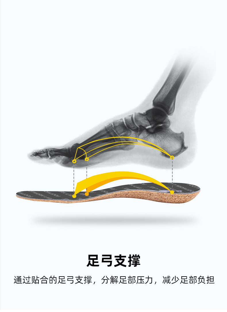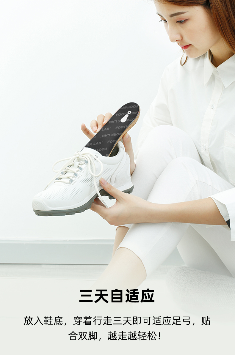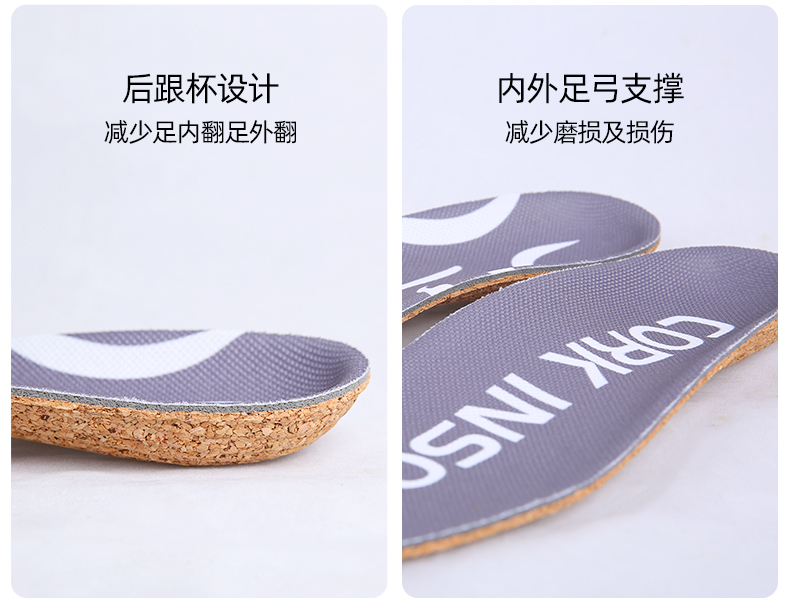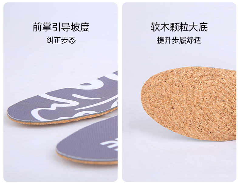 设计上面也用足了心思,芯迈的专利科技 微塑形 ,在使用鞋垫3天后,自动将鞋垫调试到最贴合你的高度,提供最合适你的支撑力度;独特的承托设计,有助于分散足部压力,走路多了不容易累脚;同时由于软木天生的大孔隙度,吸湿排汗性天生更胜一筹,所以不容易臭脚。