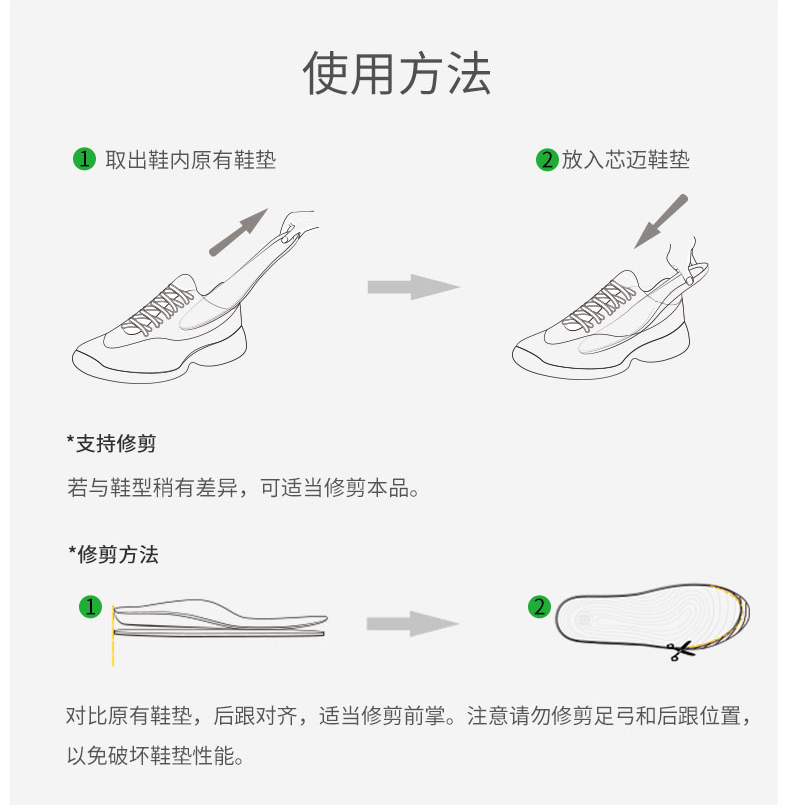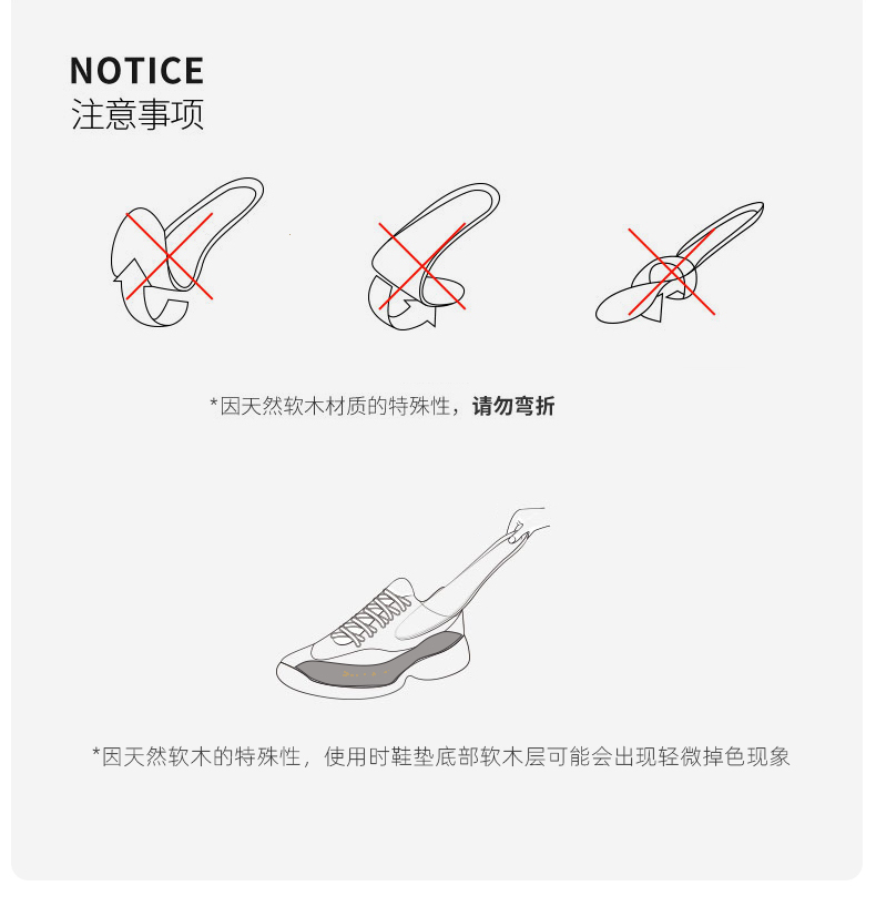 除此之外,如果鞋垫买大了,或者不合适鞋子的版型,这款鞋垫是可以自行修剪的,虽然为软木基底,但是经过特殊处理后,修剪不会掉屑(后跟和足弓处因特殊曲面保护设计,不能修剪)。